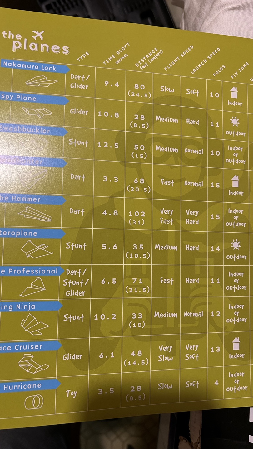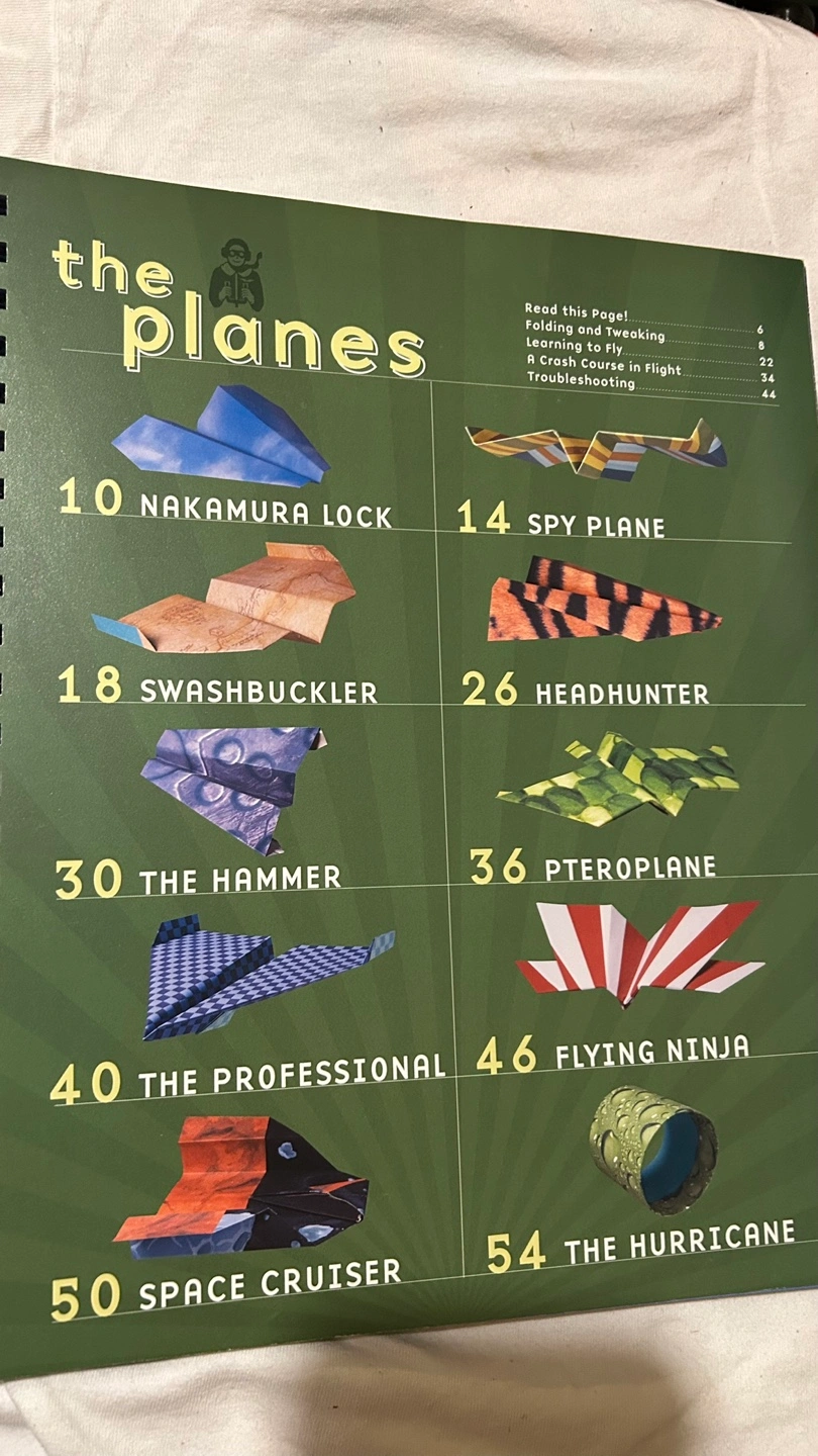 Learn to fold and fly various paper airplanes. Includes instructions and diagrams for many different designs. Spiral-bound book in good condition, still includes various (not all) paper sheets to fold with.