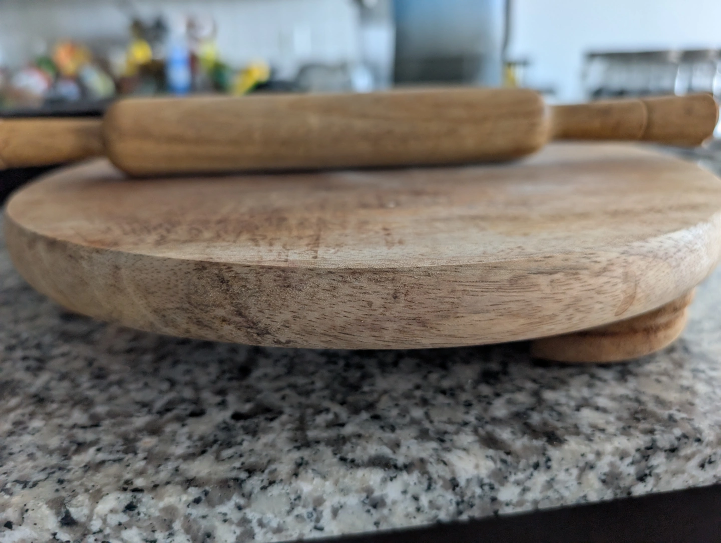Round wooden dough board. Includes a matching wooden rolling pin. Great for baking and cooking.