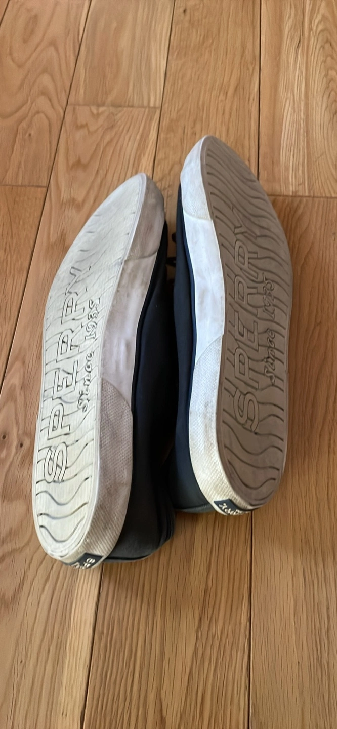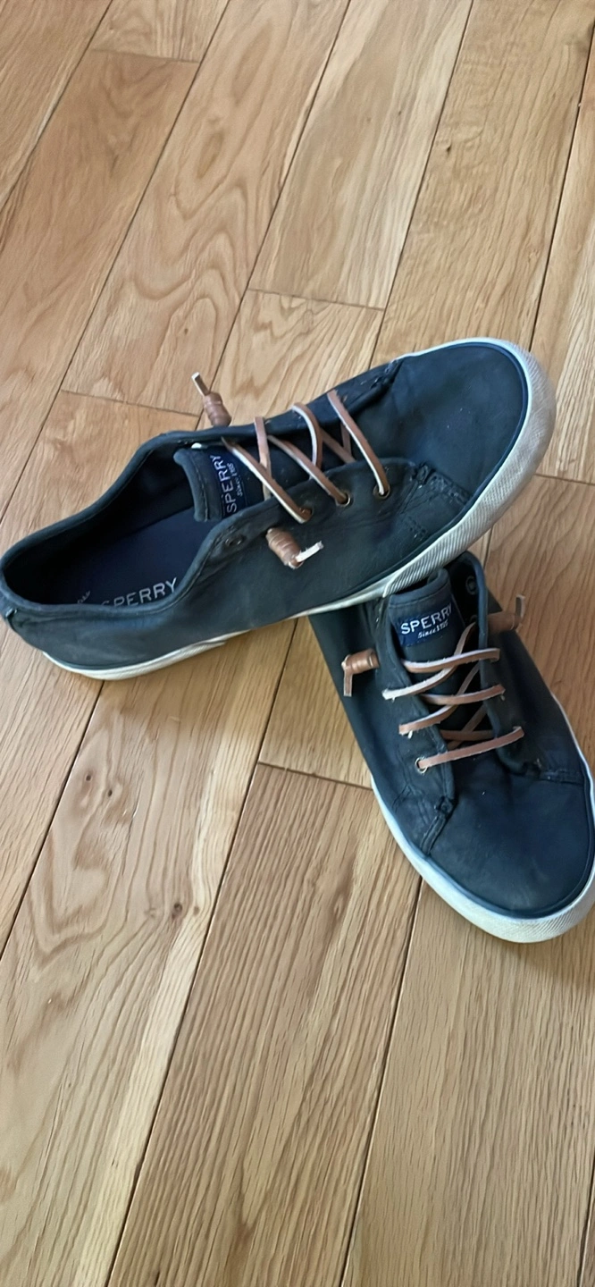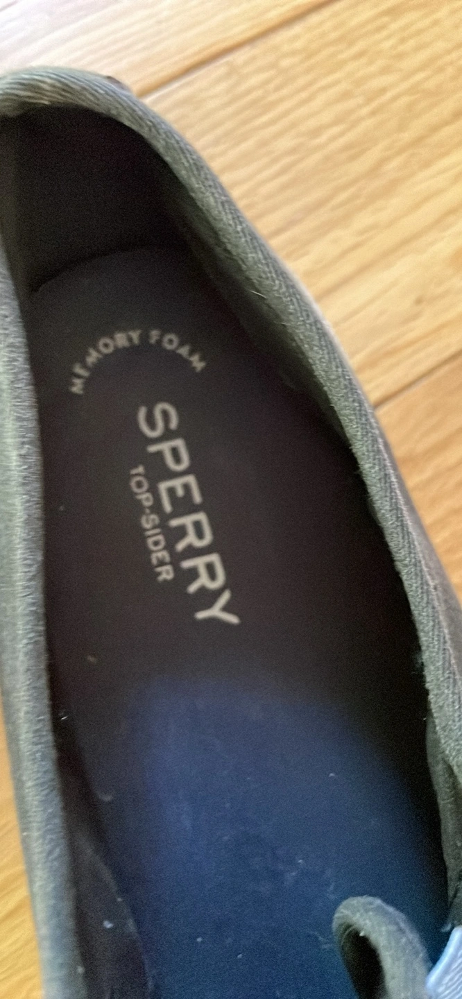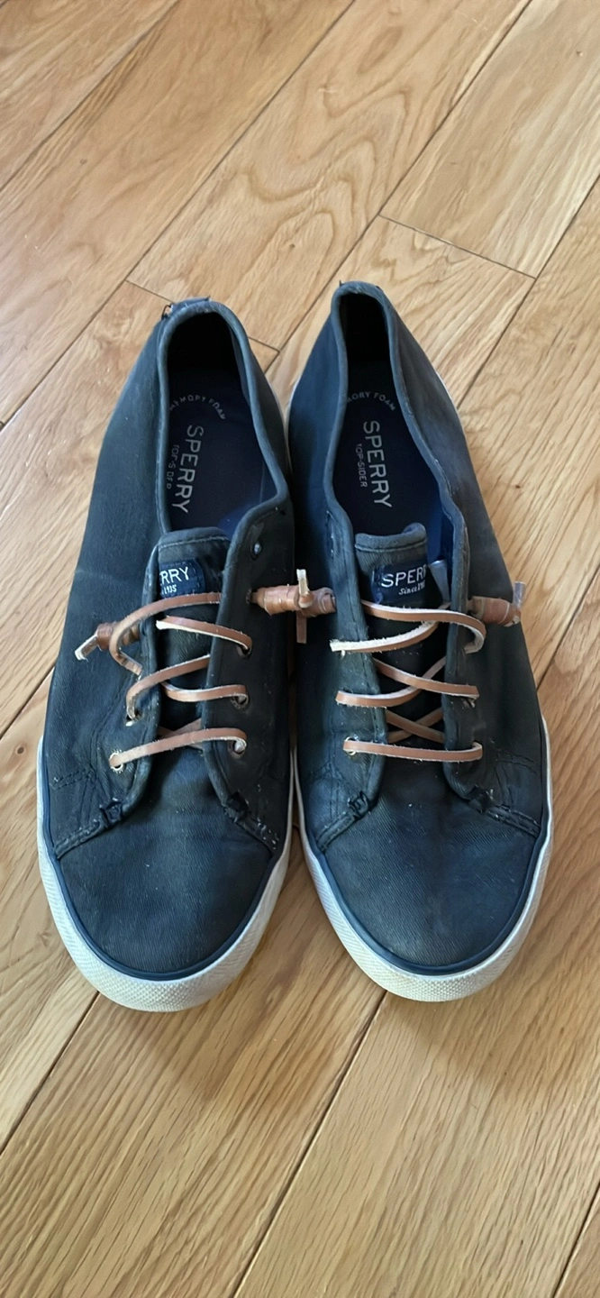 Women's dark grey canvas Sperry Top-Sider sneakers. Memory foam insoles. Light-coloured laces. Pre-owned, some wear.