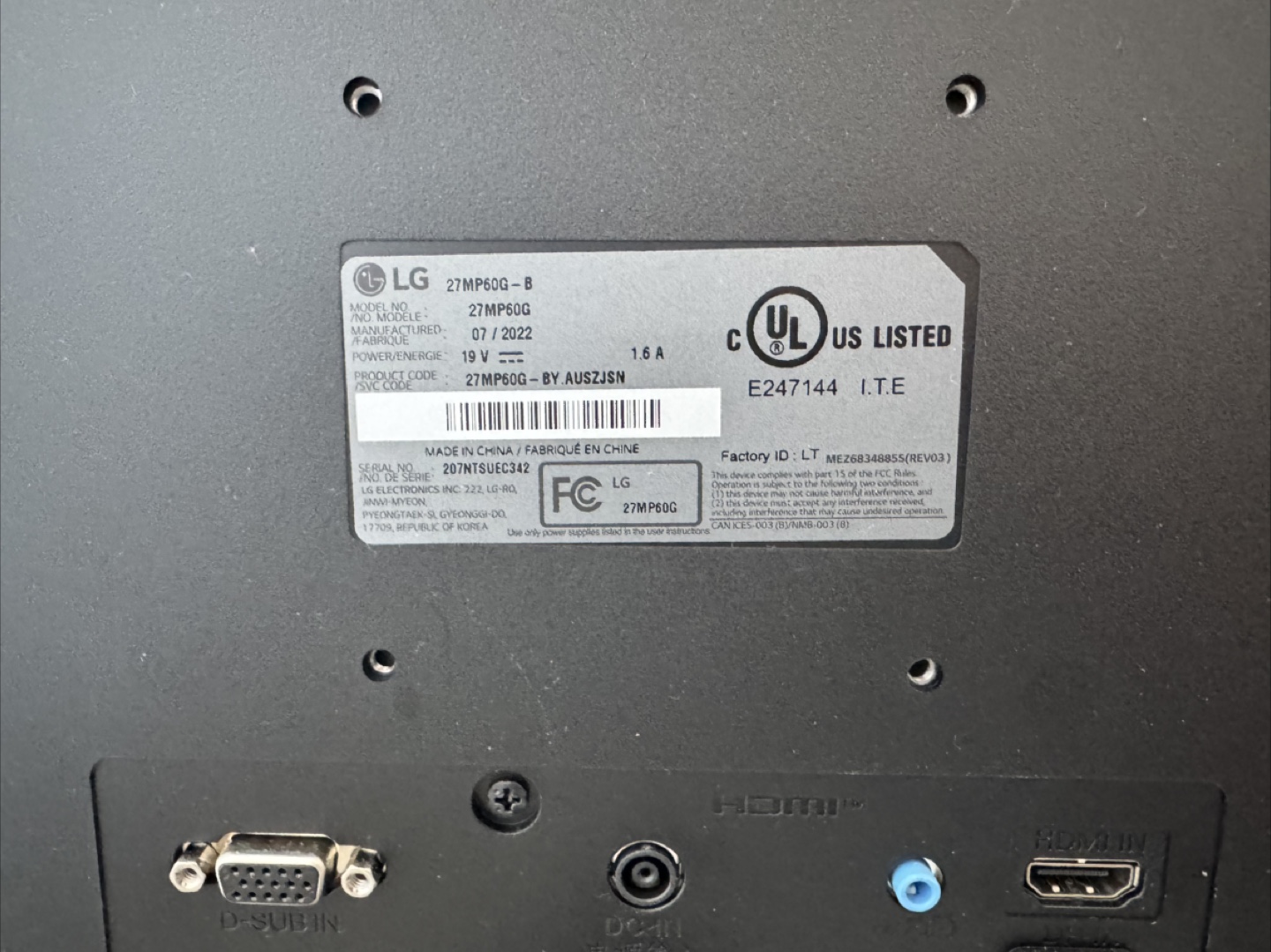27-inch LED monitor. Great for gaming and everyday use. Includes HDMI and D-SUB inputs. Model number: 27MP60G-B