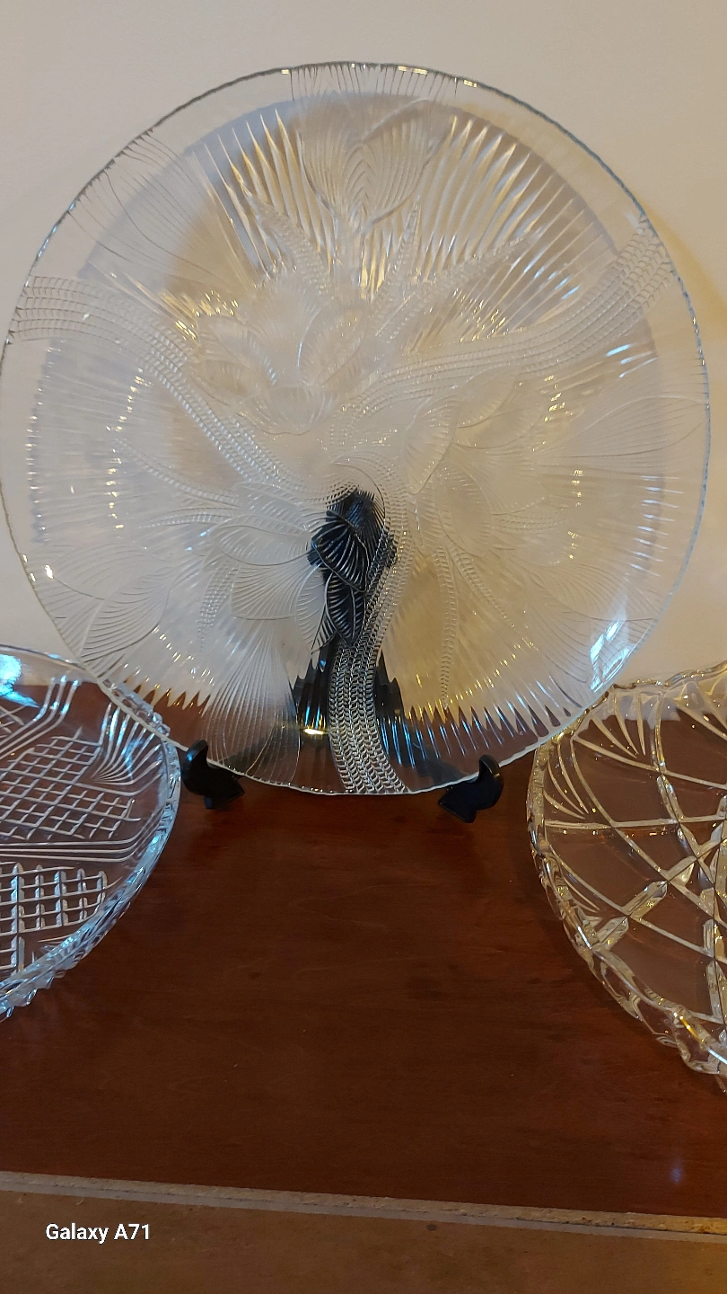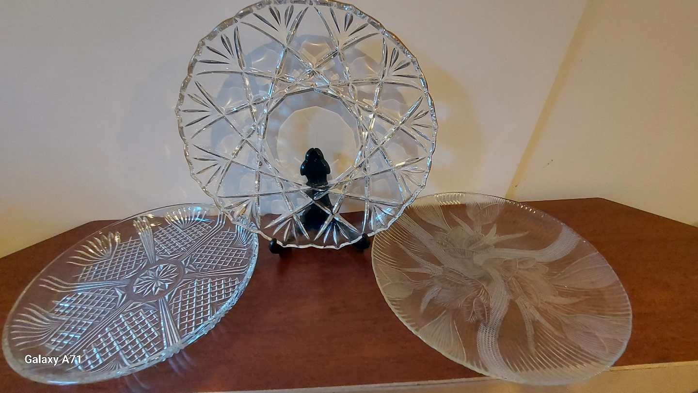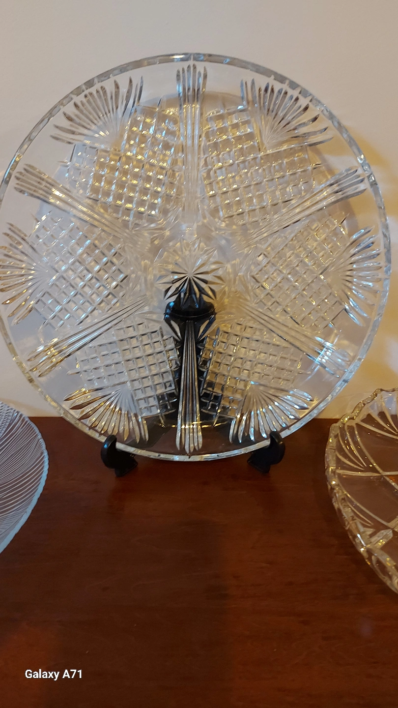 Three lovely vintage crystal serving dishes. One large round plate and two smaller oval plates. Intricate cut designs. Perfect for entertaining or adding to a collection. No Delivery, Cash Deal . Each one is $ 7