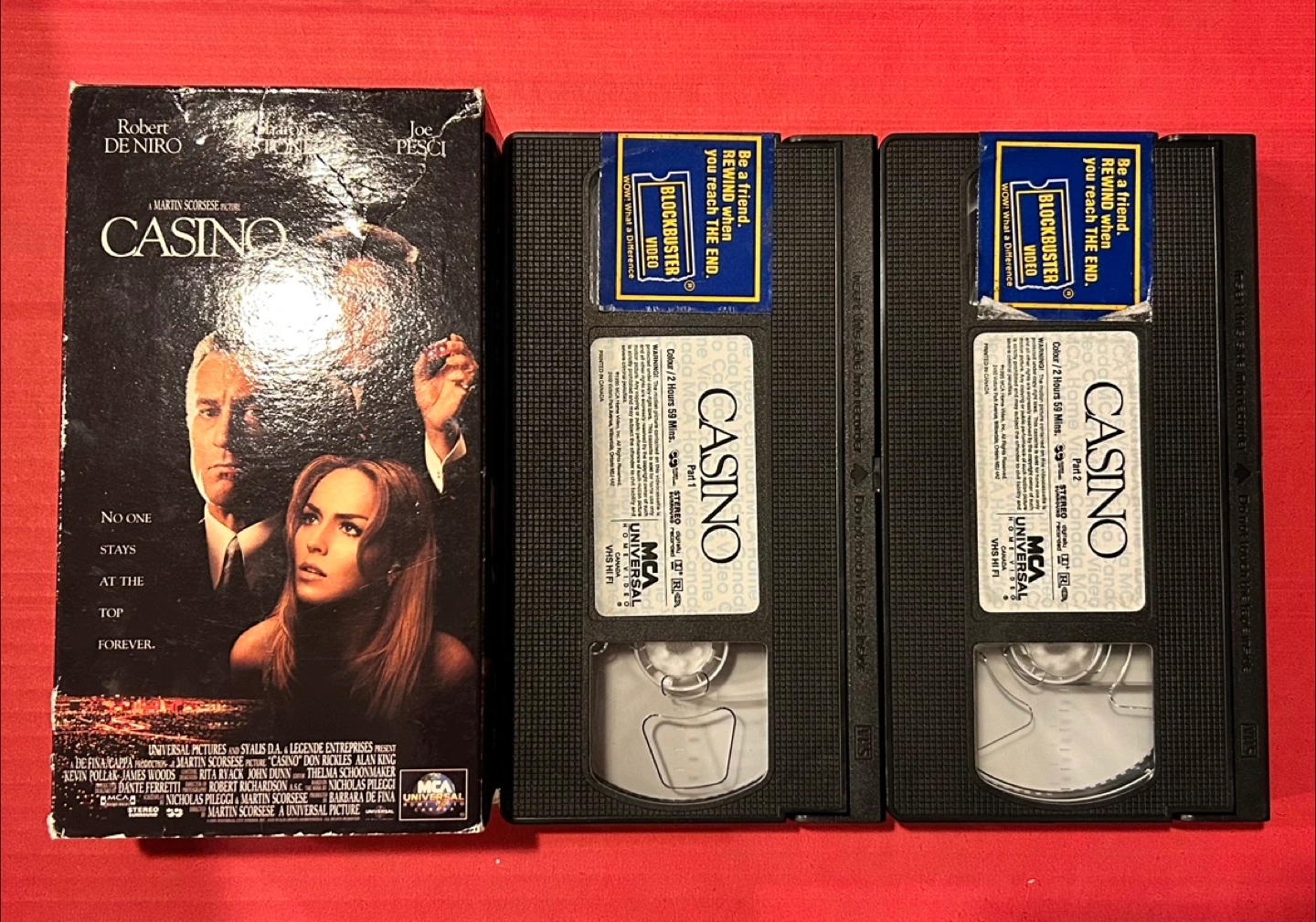 VHS tape of the classic film Casino. Features Robert De Niro, Sharon Stone, and Joe Pesci. Includes two tapes. Blockbuster sticker on tapes. 😊
