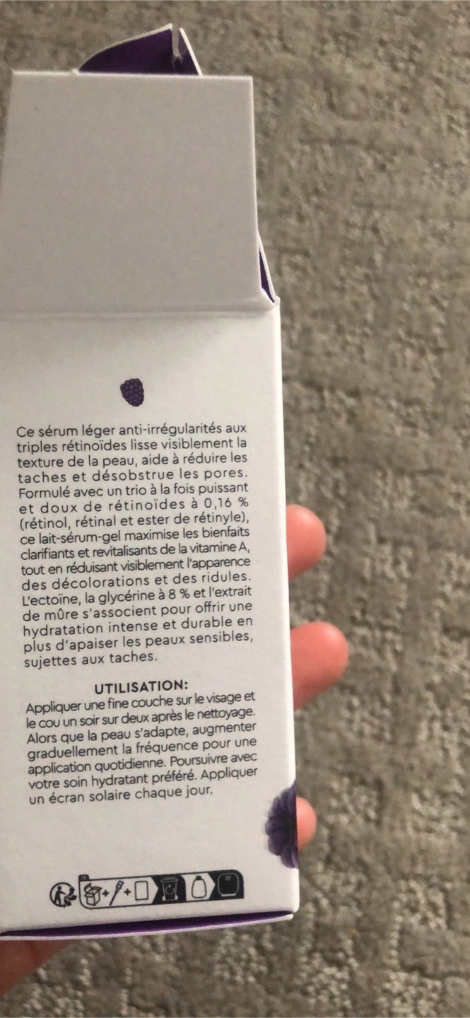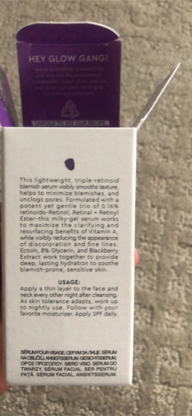 Lightweight, triple-retinol blemish serum. Minimizes blemishes, smooths texture, and potent yet gentle. Contains 0.16% retinoids—retinol, retinal, and retinyl. Works while visibly reducing the appearance of discoloration and fine lines. Blackberry Extract soothes blemish-prone skin.