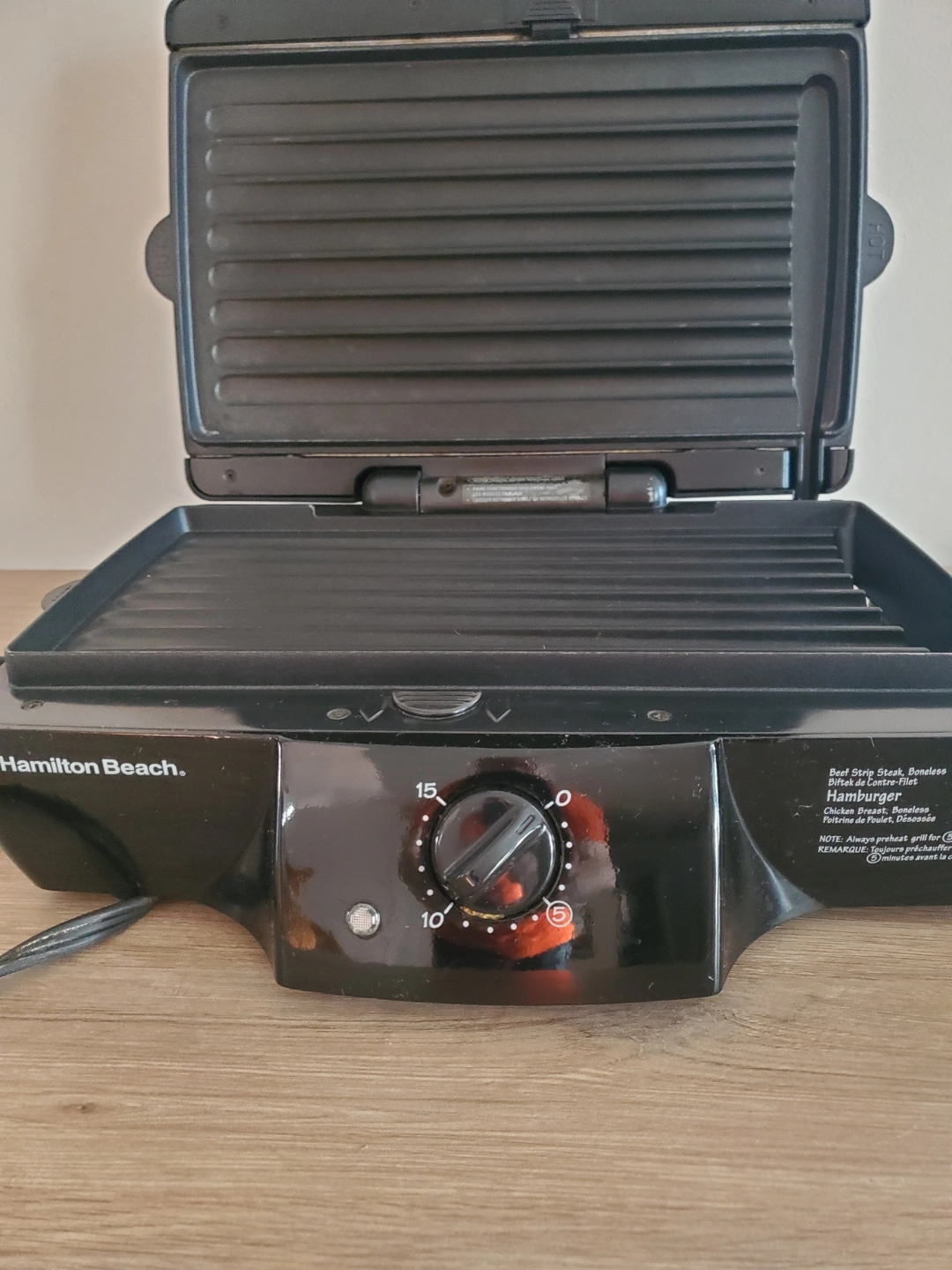 used Black electric contact grill. Removable dishwasher-safe grids. Temperature control dial. Power cord included. Great for grilling various foods. slightly used