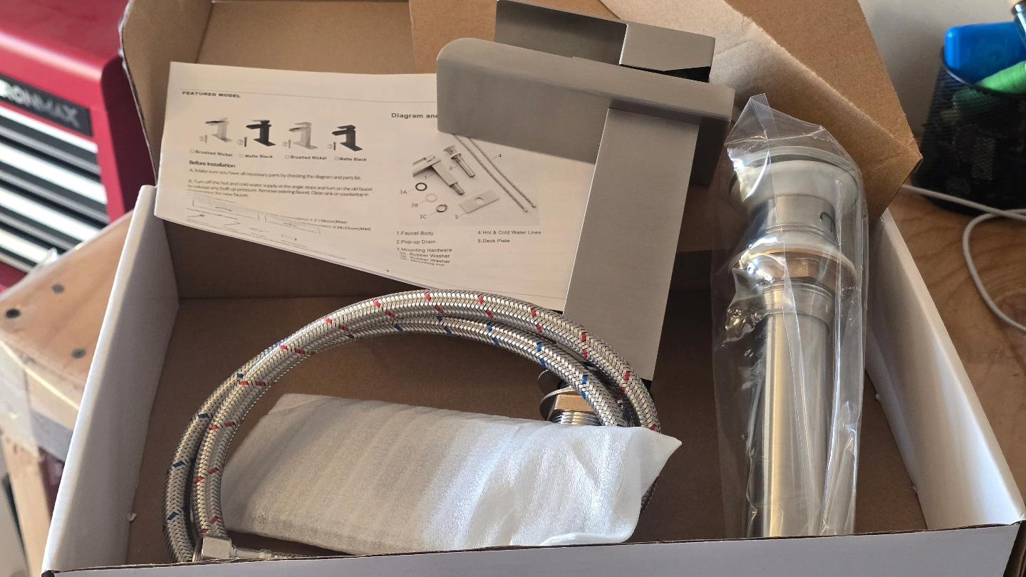 Brand new in box. Single handle bathroom faucet. Brushed nickel finish. Includes faucet body, pop-up drain, mounting hardware, and hot & cold water lines. Easy installation.