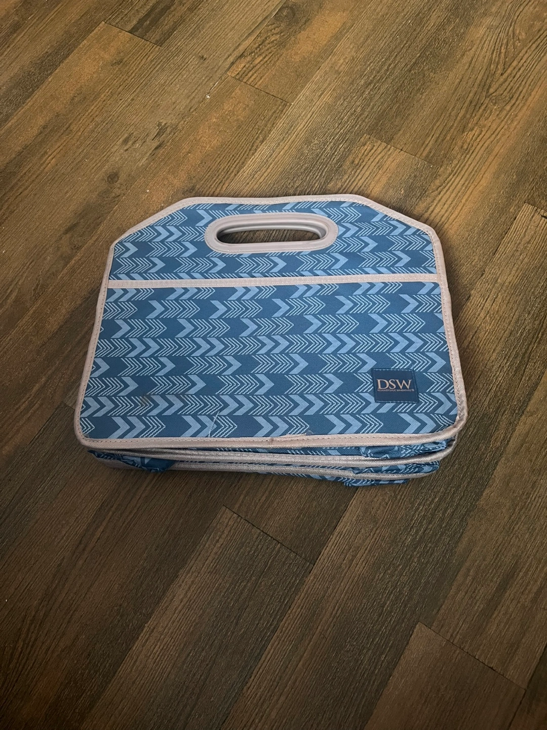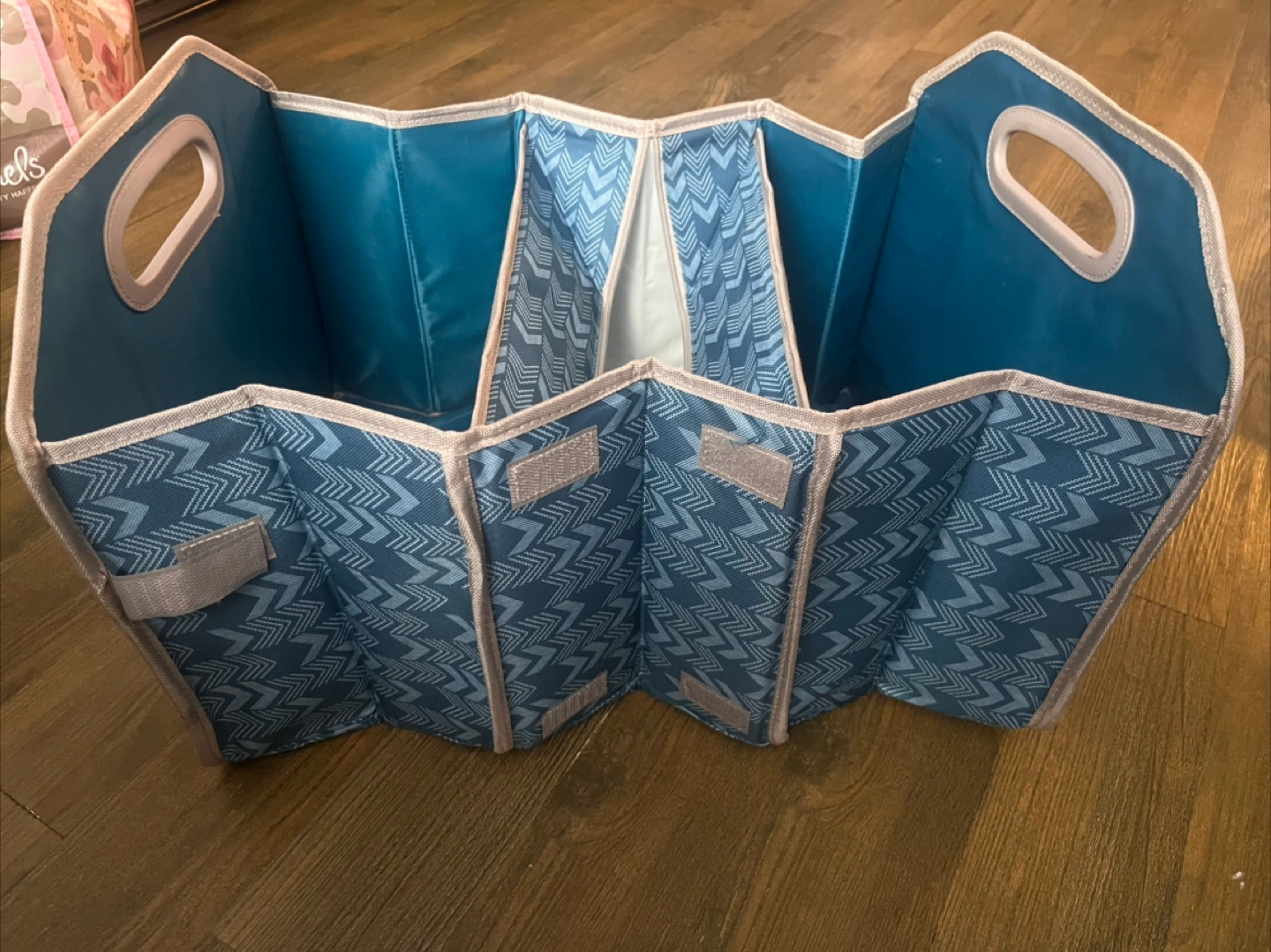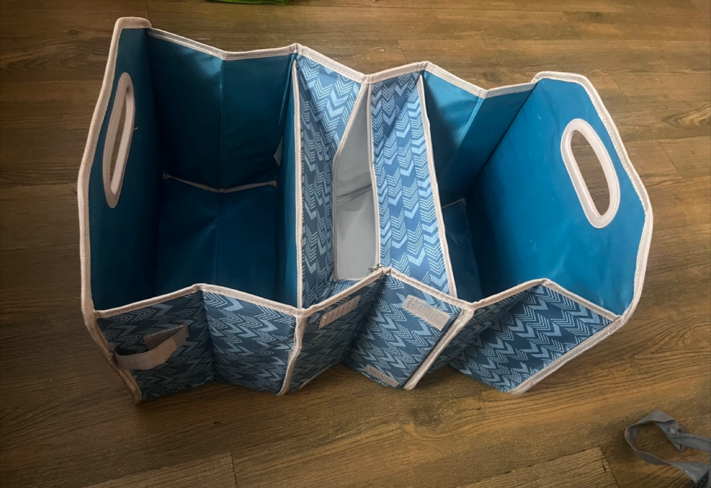 Foldable storage tote. Blue and gray chevron design. 3 compartments, 2 open and 1 zippered. Great for organizing items or holding groceries in the trunk of a car.