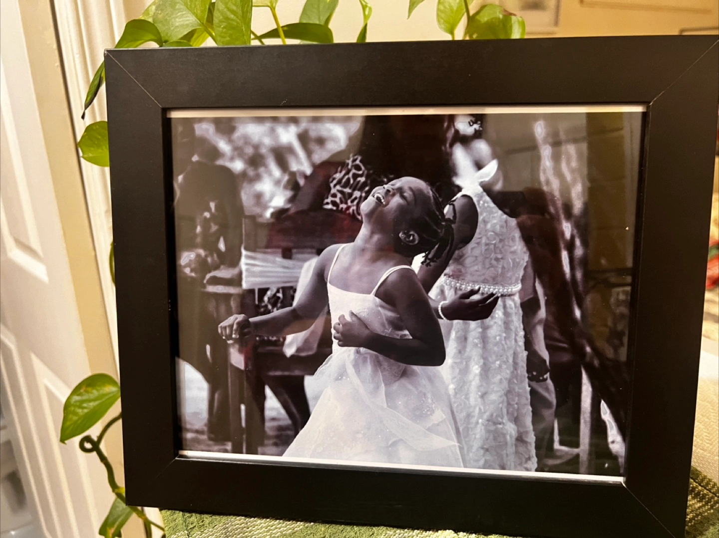 Striking black and white photograph featuring a young girl in a white dress in Jamaica at the wedding. Elegantly framed in a simple black frame, this piece is in excellent condition and ready to hang. Perfect for a child’s room, nursery, or as part of a curated gallery wall.