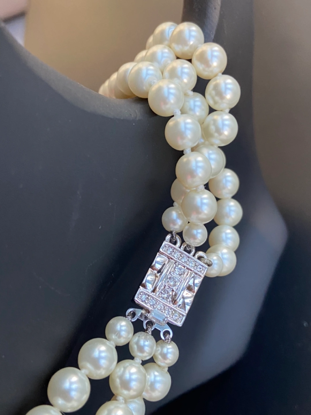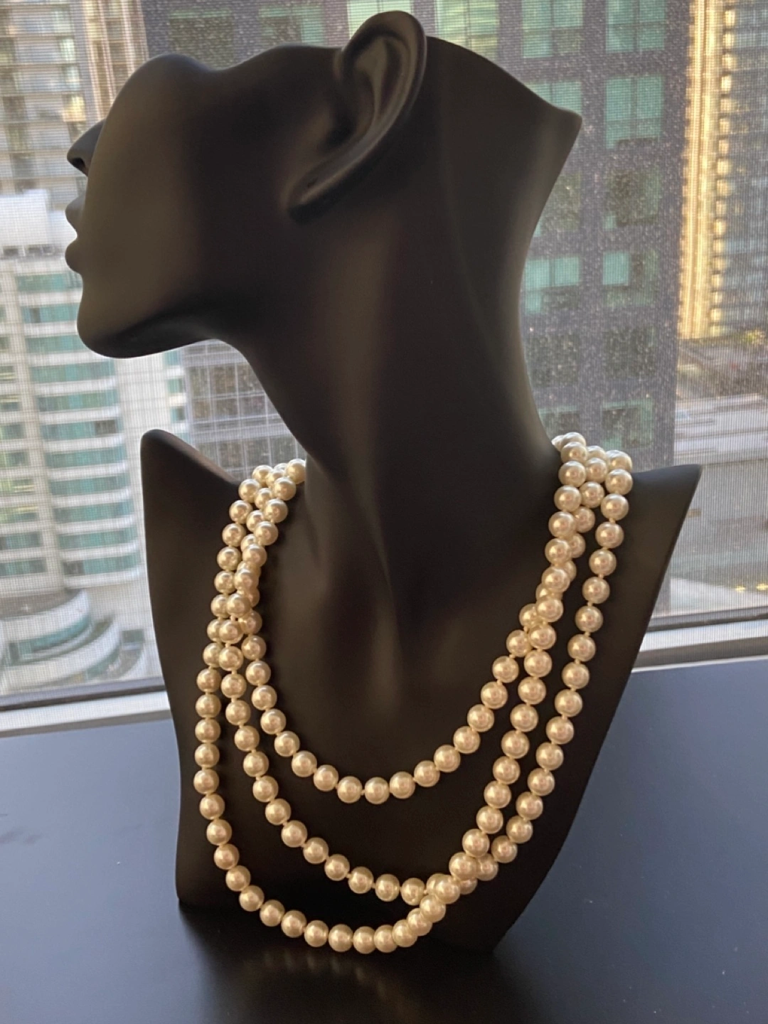 This Camrose & Kross three-strand faux pearl necklace set is a replica of one worn by former First Lady Jacqueline Kennedy. Jacqueline had many pearl necklaces, but the triple-strand is the one she wore the most. The necklace has ivory-color Czech glass hand-painted pearls strung on silken cords and hand knotted. The clasp is rhodium plated and has Swarovski crystals in it.