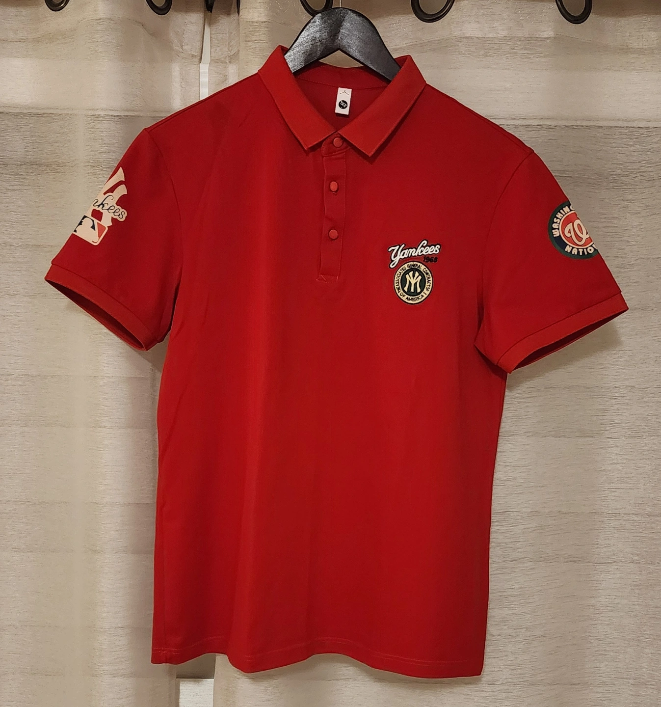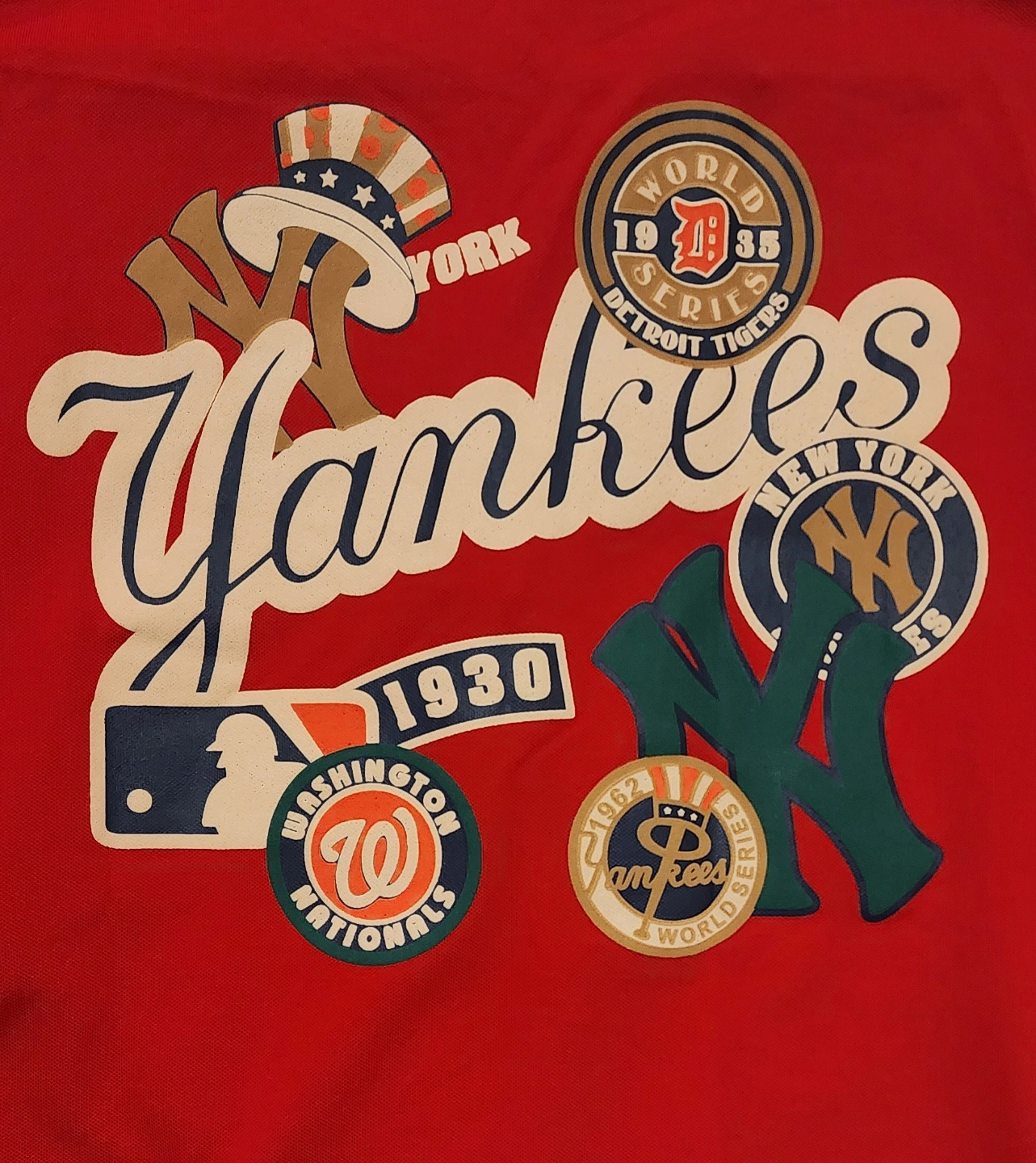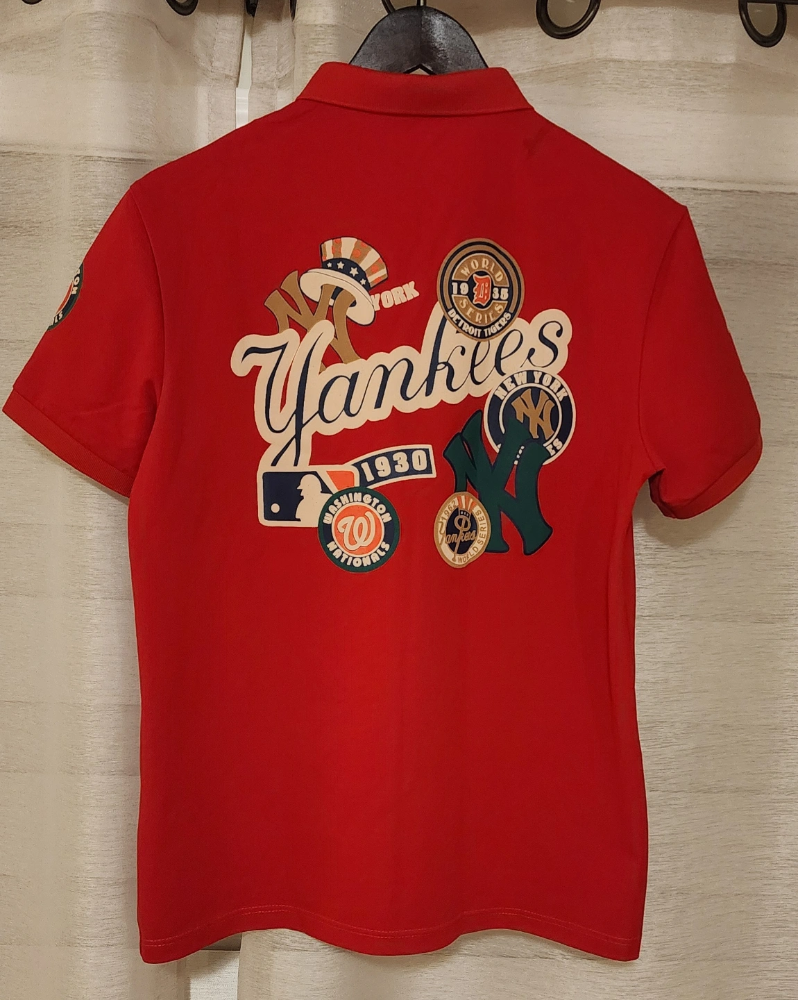 Men's red short sleeve polo shirt. Features various baseball team logos and text. Great for casual wear.