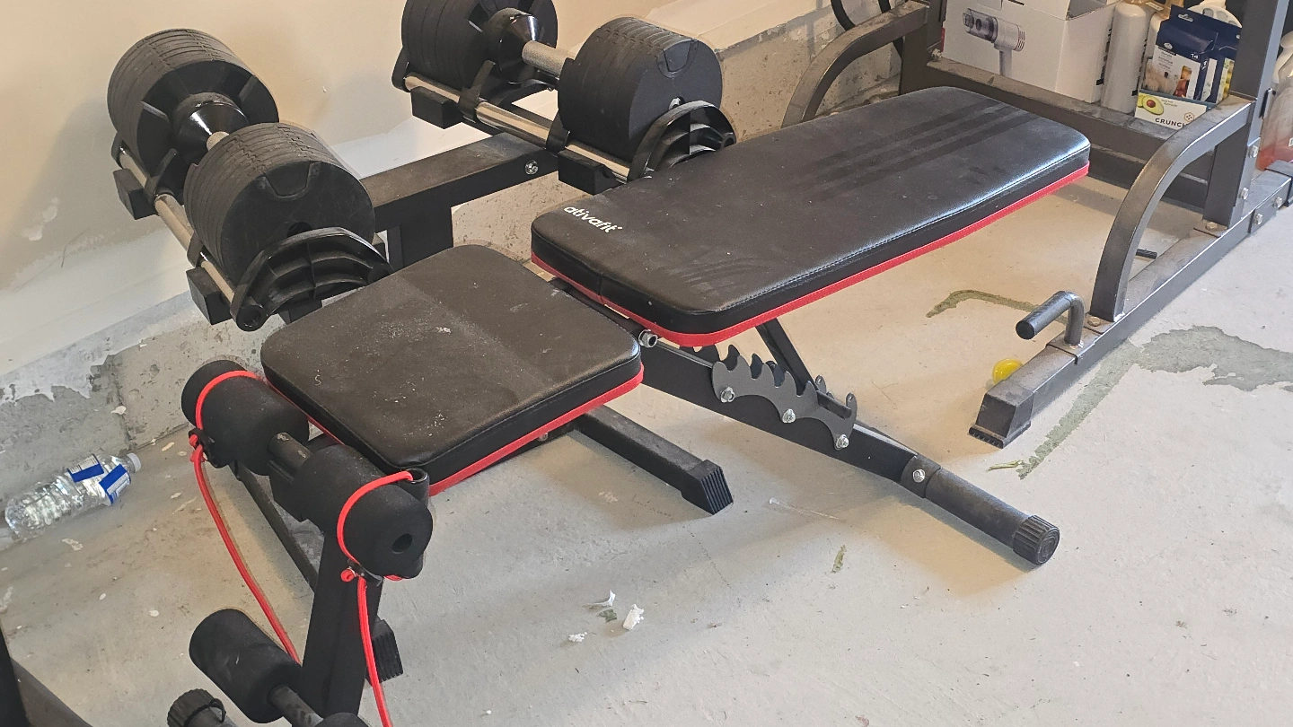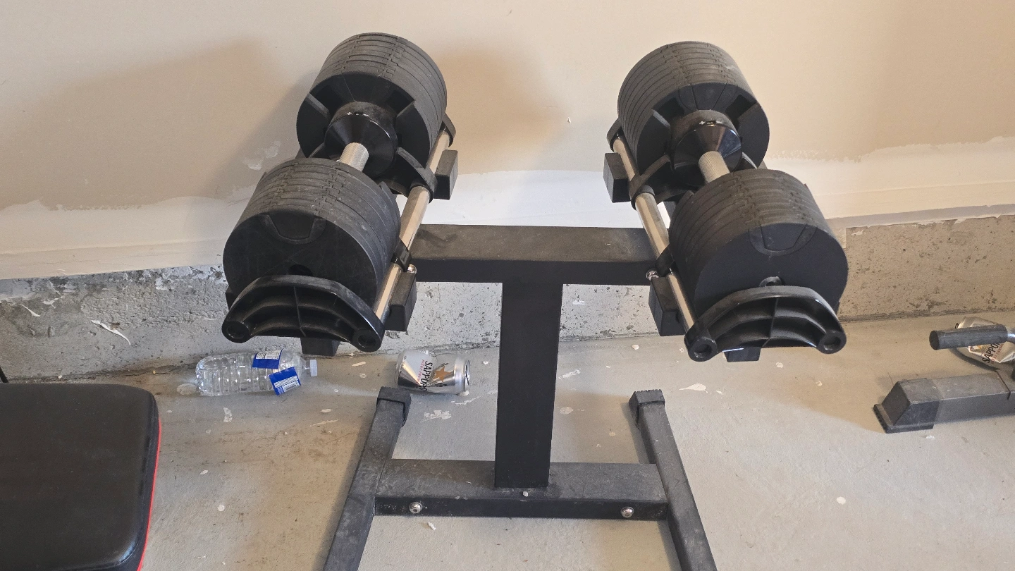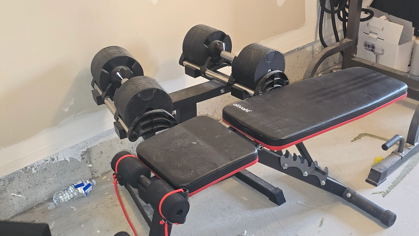 Pair of adjustable dumbbells, weight bench included. Rack for storage. Great for home workouts. Good condition.