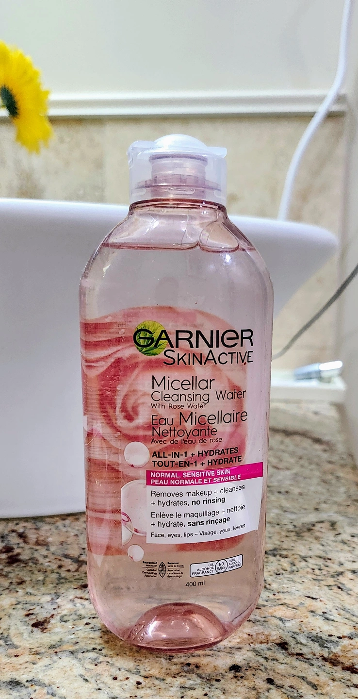 49400ml bottle of Garnier SkinActive Micellar Cleansing Water. Removes makeup, cleanses and hydrates. Suitable for normal and sensitive skin. No rinsing required. Use on face, eyes, and lips.