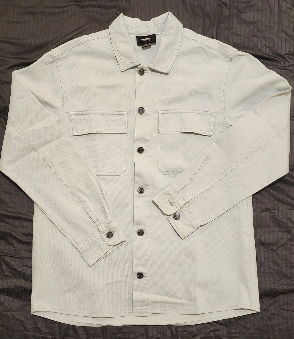 Long-sleeved light grey denim shirt jacket. Button closure. Two chest pockets. Good condition. Size large.