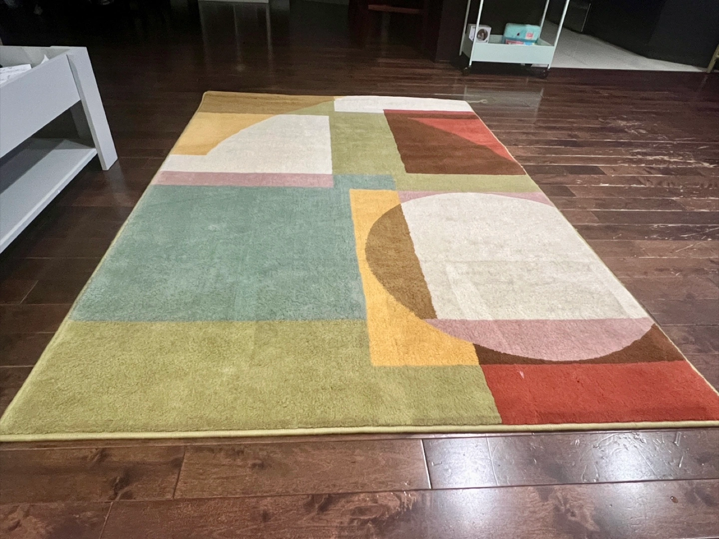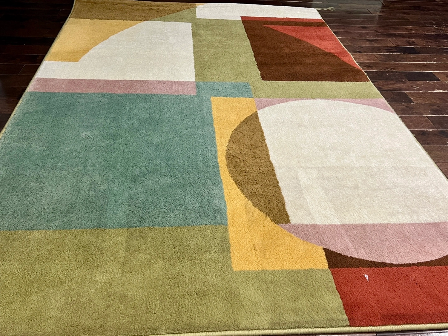 Modern abstract design. Multicoloured geometric pattern. Machine washable. Good condition. Measures 133x195 cm (4'4"x6'5").
