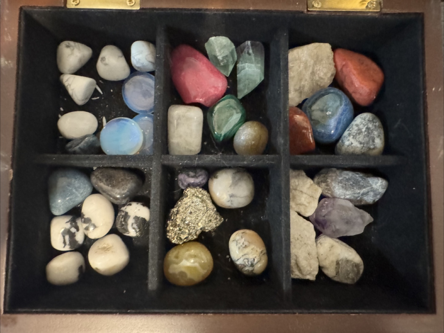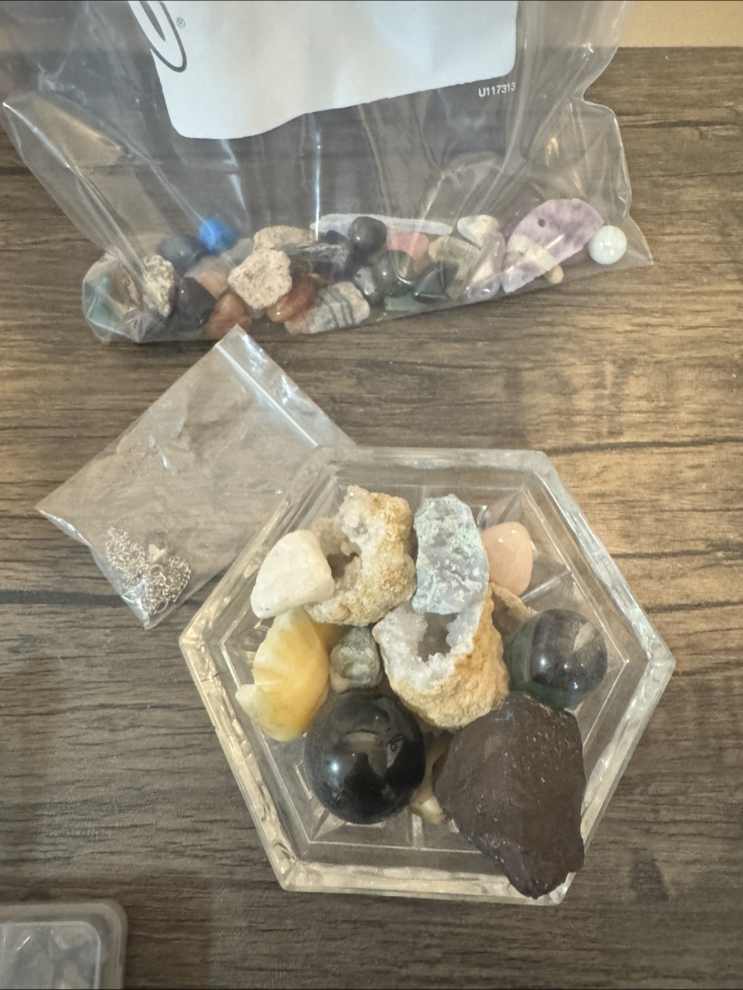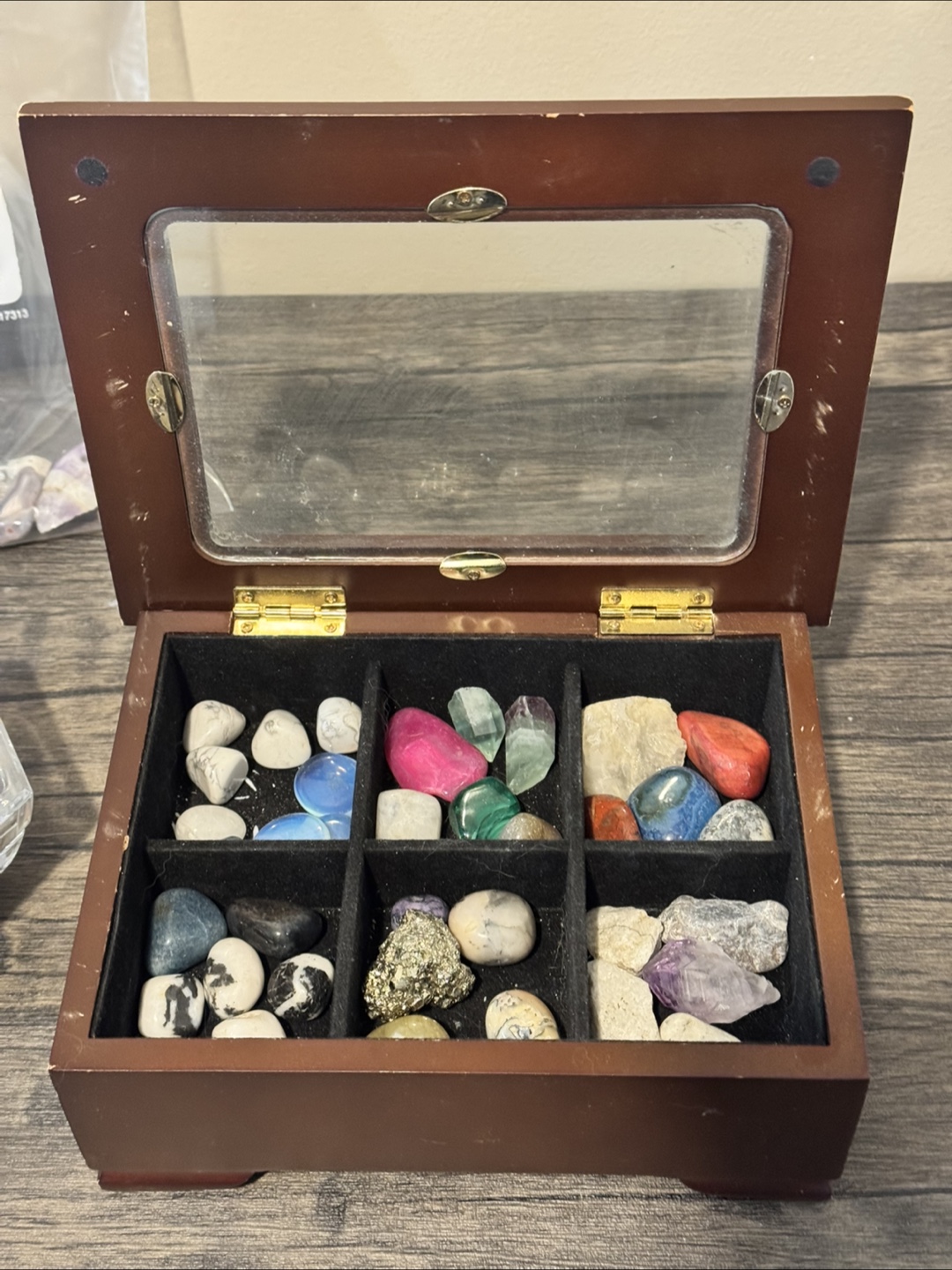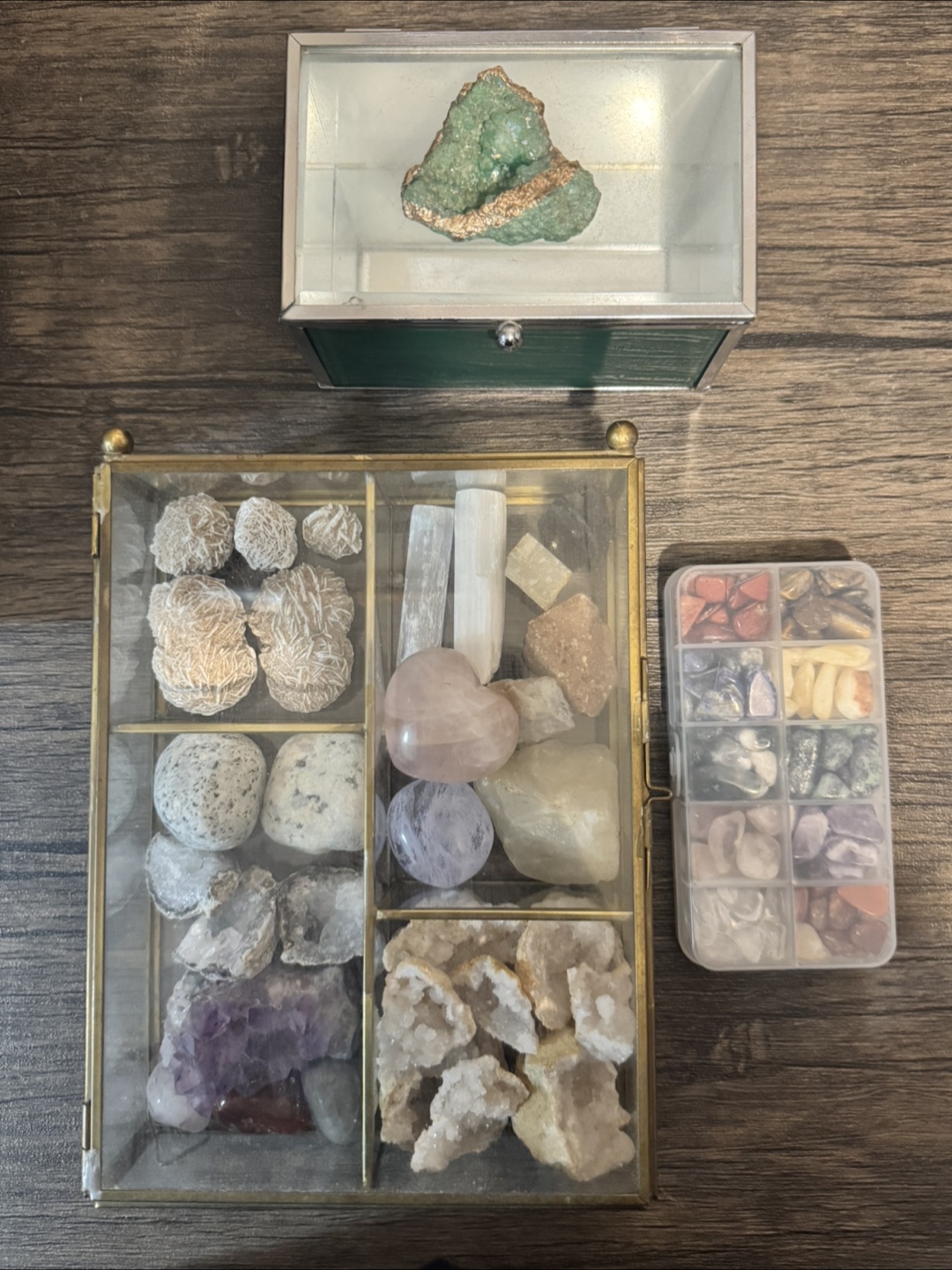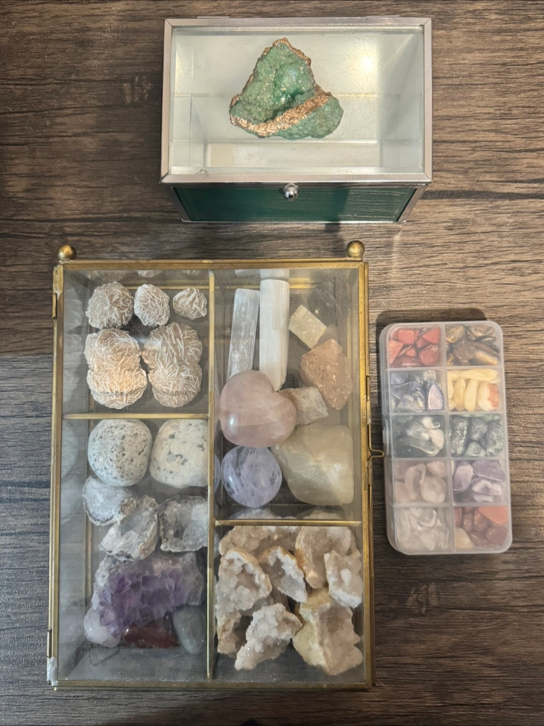 This collection of various crystals and stones includes multiple display cases, making it perfect for collectors or enthusiasts. It features geodes, tumbled stones, and raw specimens.
