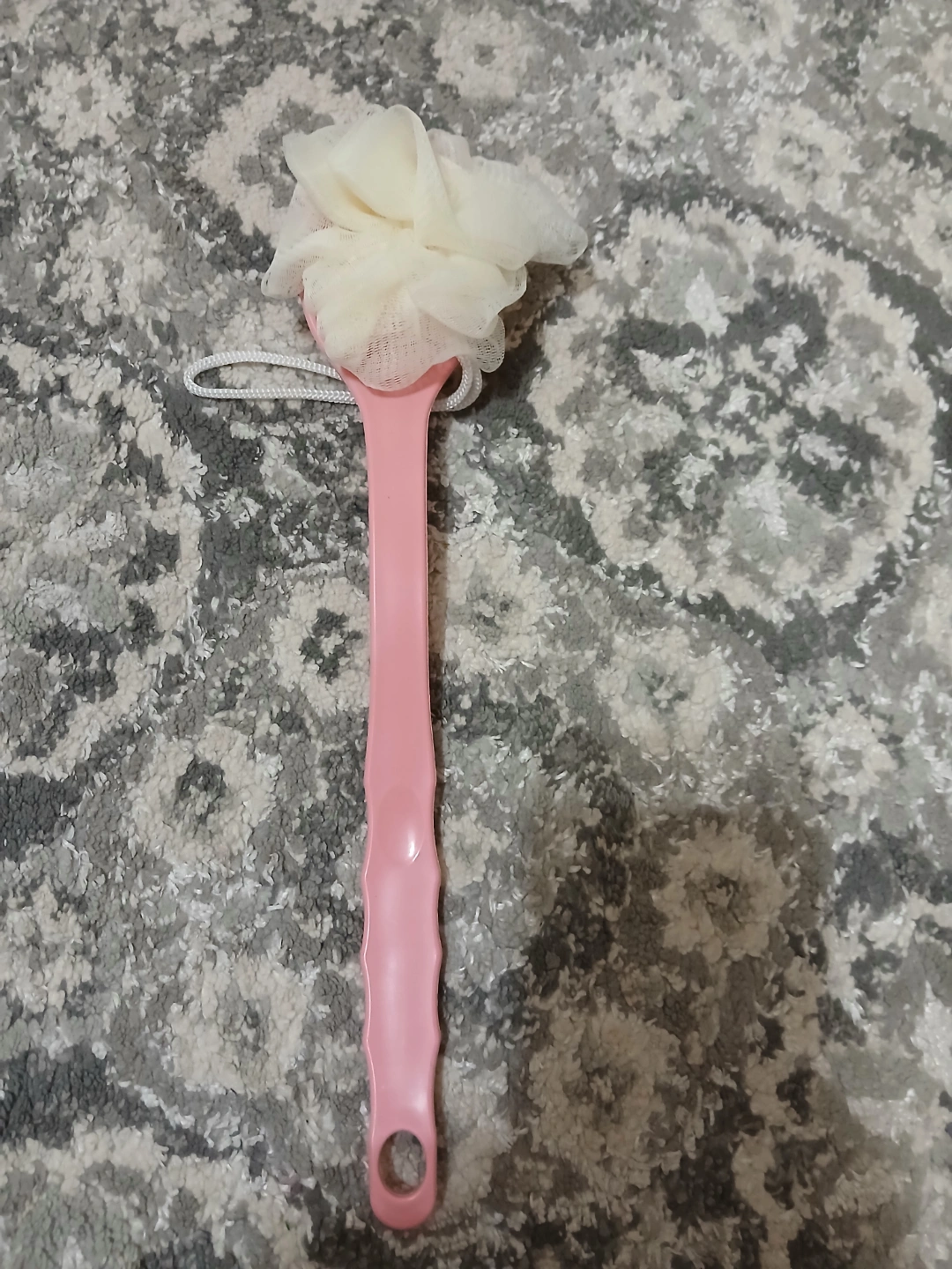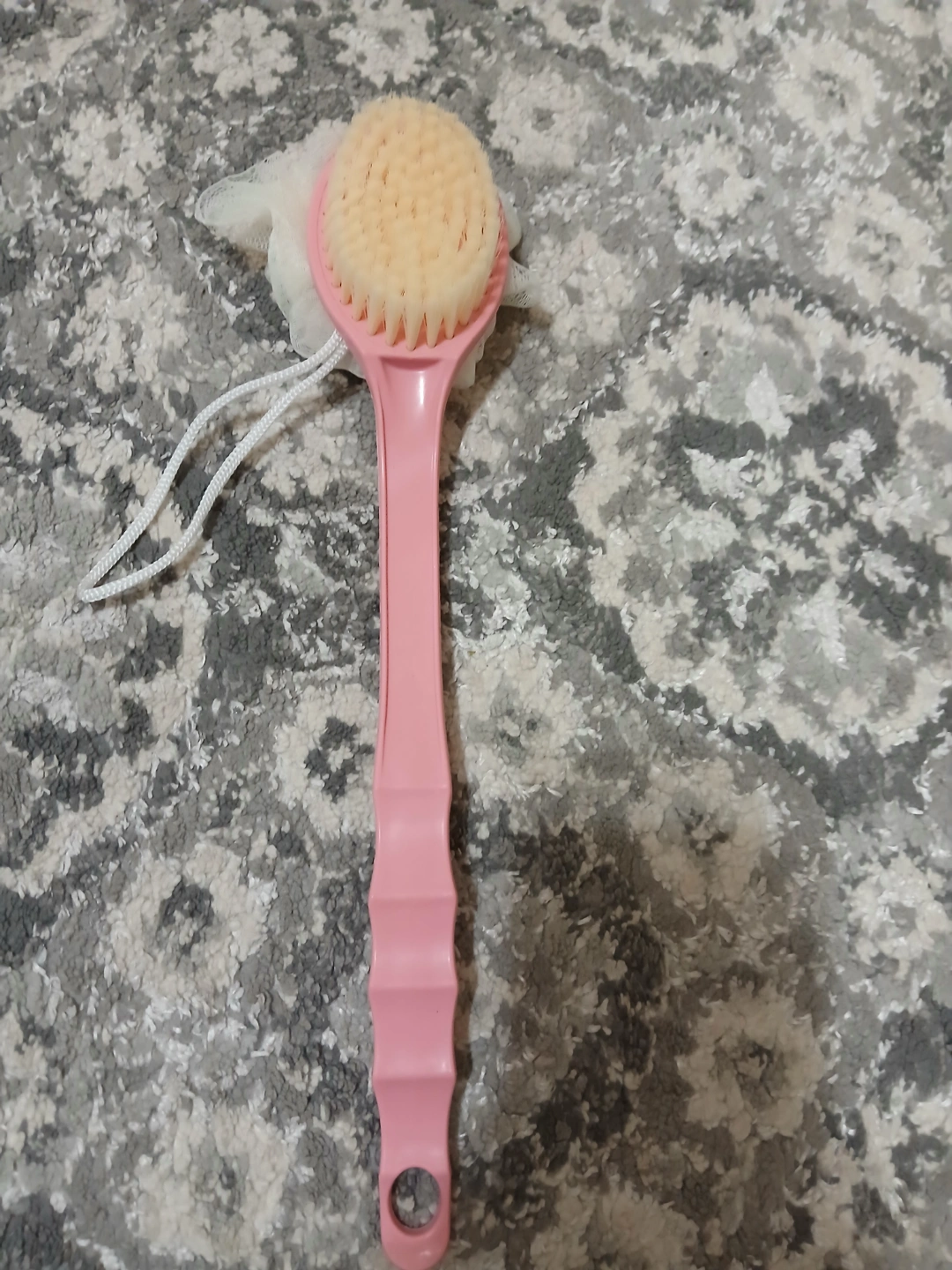 Pink plastic handle. Soft exfoliating brush head. Attached mesh sponge. Great for back scrubbing.