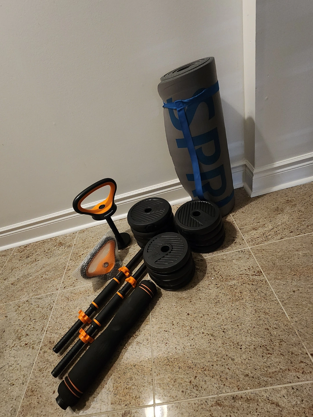 Complete home fitness kit for sale. This set includes adjustable kettlebells, which can also be used to support floor exercises, as well as dumbbells that can be connected with an additional bar to create a barbell. It also comes with a 1/2-inch thick exercise mat, making it ideal for strength training workouts. All items are in excellent condition. The kit includes 8 plates of 2kg each and 4 plates of 1.5kg each.