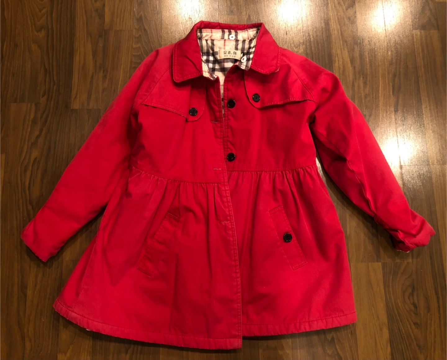 Adorable red girls' coat. Features a classic trench style with button closures. Lined with a Burberry-inspired plaid. Size 160.