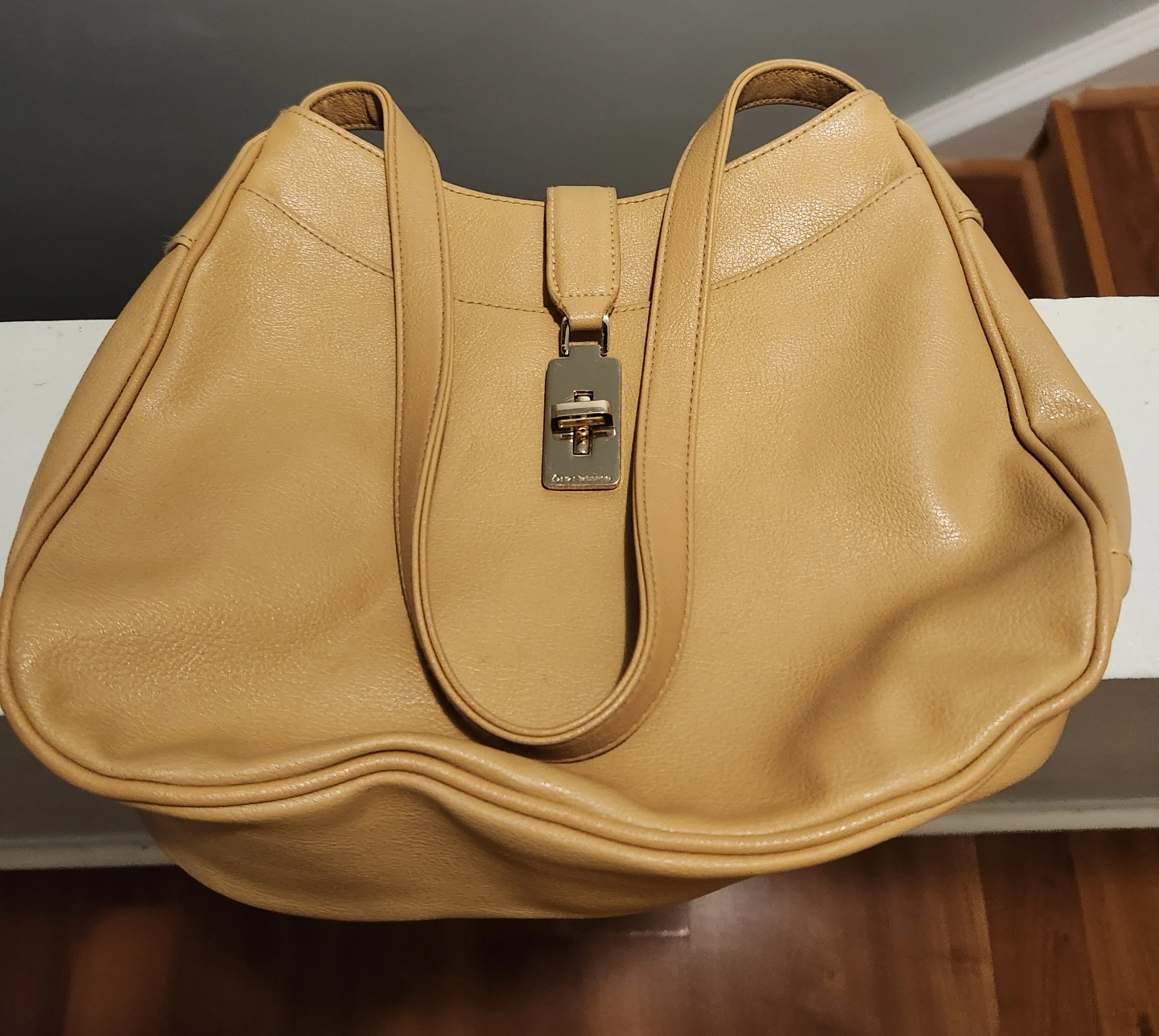 Tan leather shoulder bag. Features a gold-toned clasp closure. Interior zippered pocket and slip pockets. Gently used.