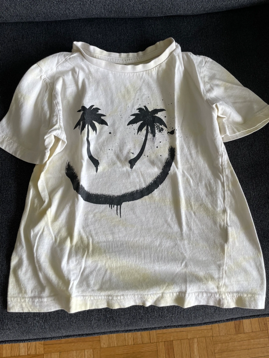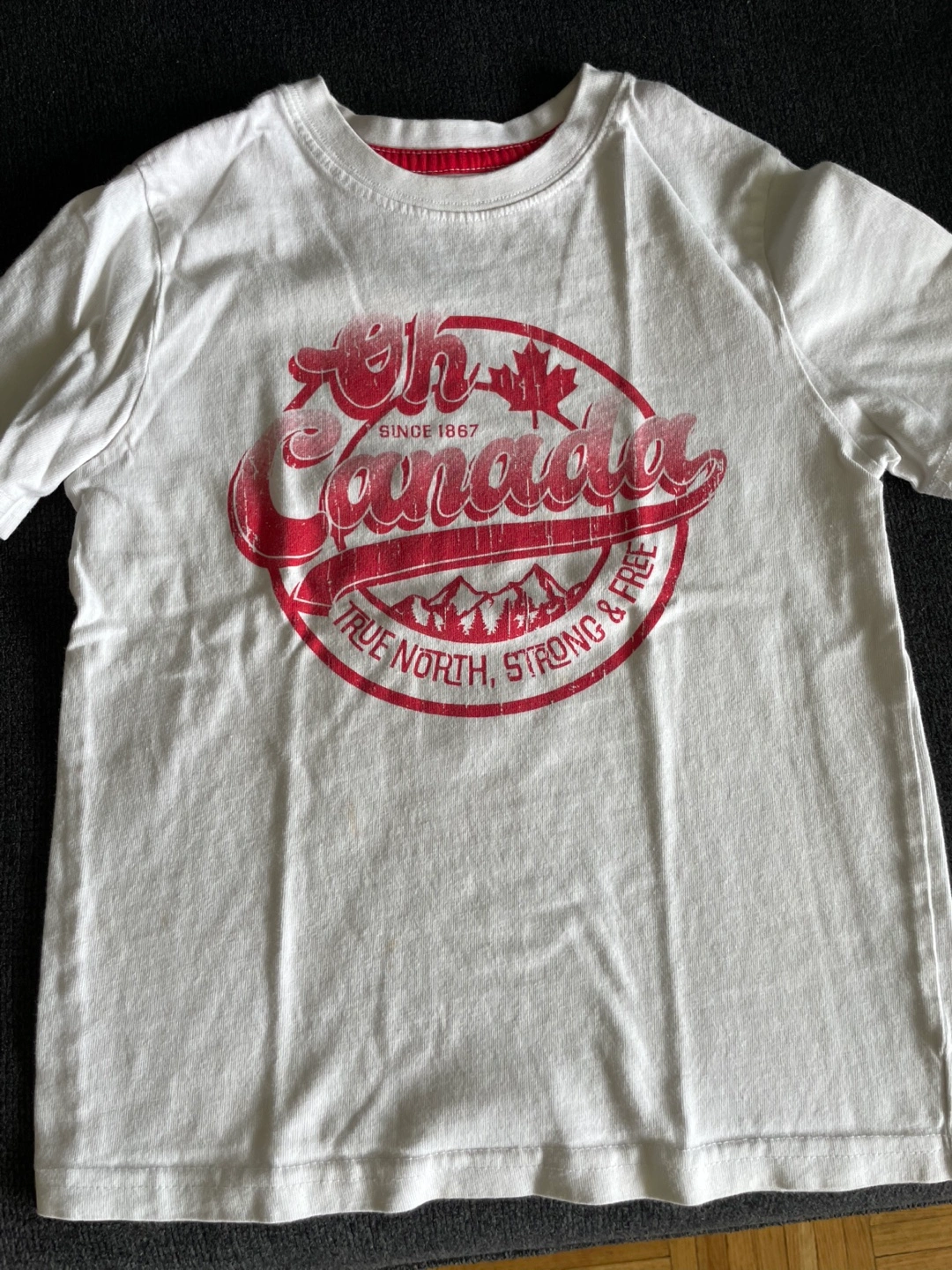 Three cute boys' t-shirts. Sizes-6 to 7years. One features a smiley face with palm trees, another has a colourful all-over print with flamingos and skateboards, and the last one has a Canadian-themed design. Pre-owned, good condition.