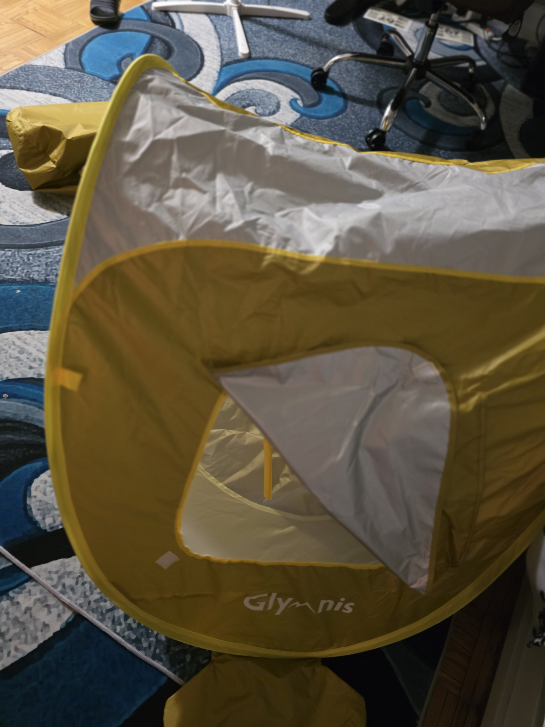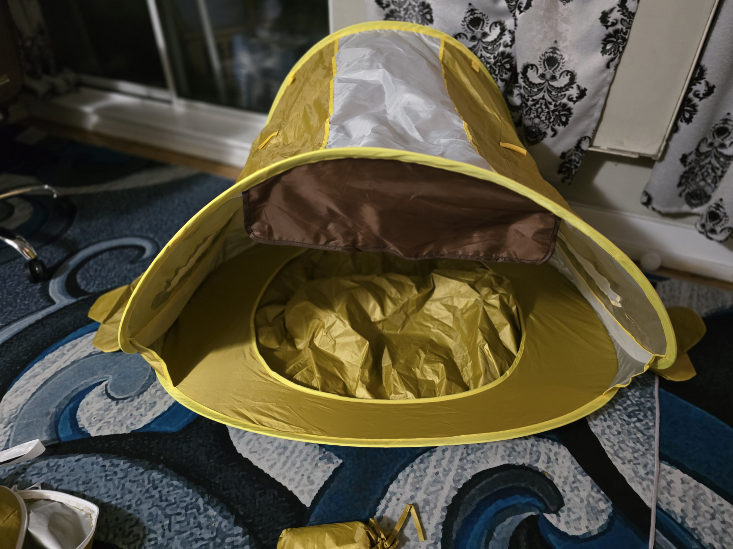 Portable children's play tent. Yellow and brown colours. Easy to assemble and store. Ideal for indoor or outdoor use. Compact design for travel. New never used