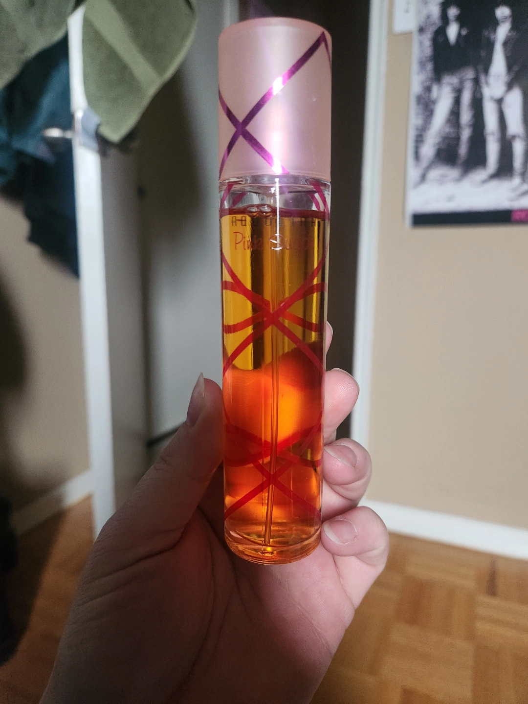 282Aquolina Pink Sugar perfume. Amber liquid in a pink bottle with red ribbon design. 50mL Willing to trade for another fragrance or body spray. Pick up only Price is firm