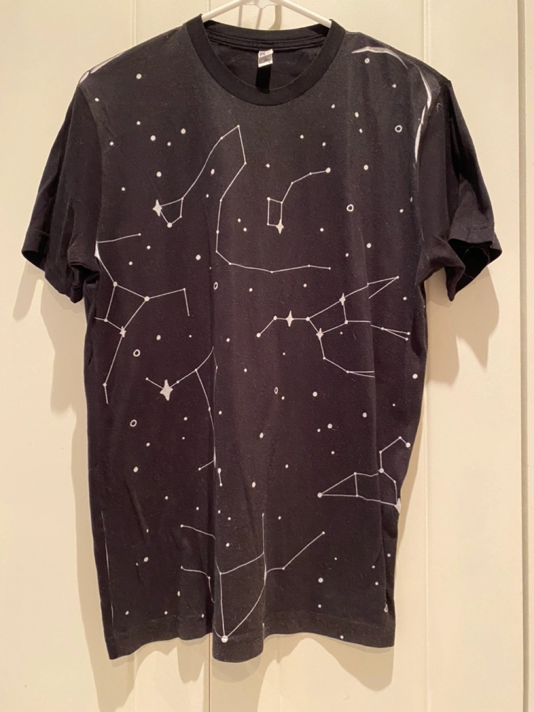 Size M. 50/50 poly-cotton. Straight cut, crewneck. Silk-screened constellations.