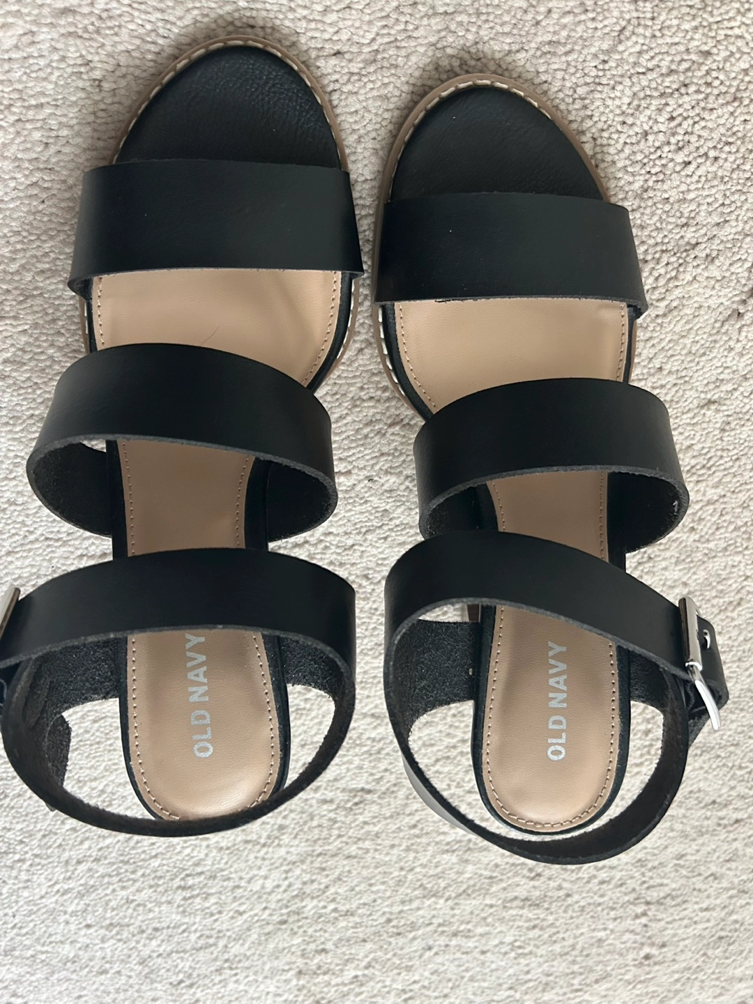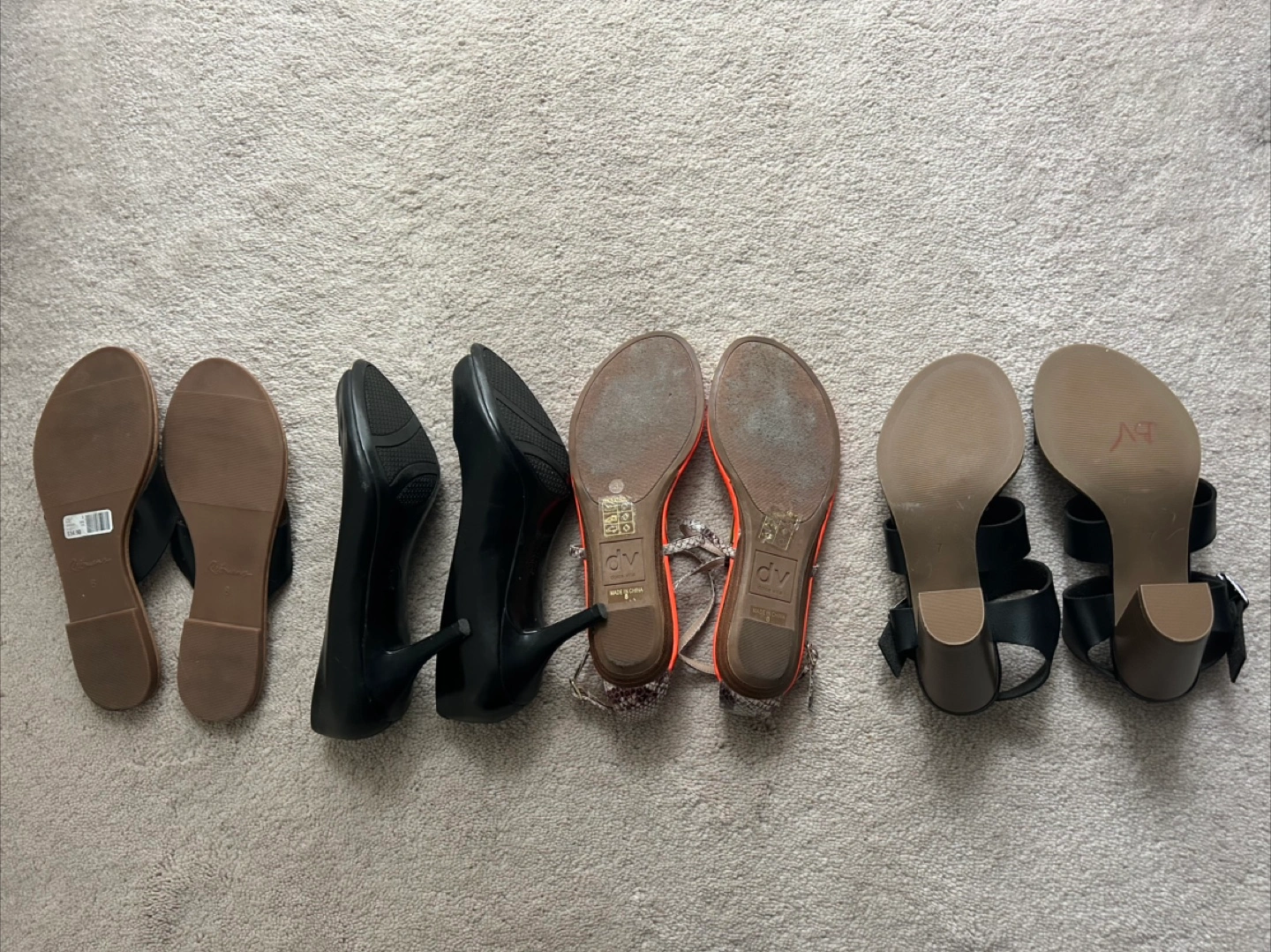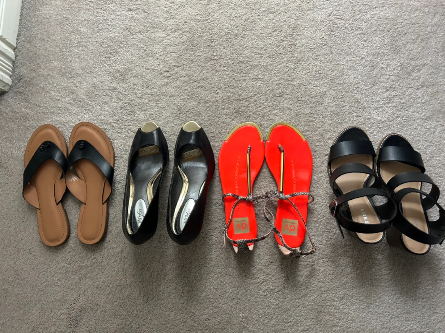 Bundle of four pairs of women's shoes. Includes two pairs of sandals in excellent condition, one pair of black open toe heeled shoes, and one pair of brand new black wedge sandals. Size 8, expect black wedge sandals are size 7. All for $25 or 1 for $10