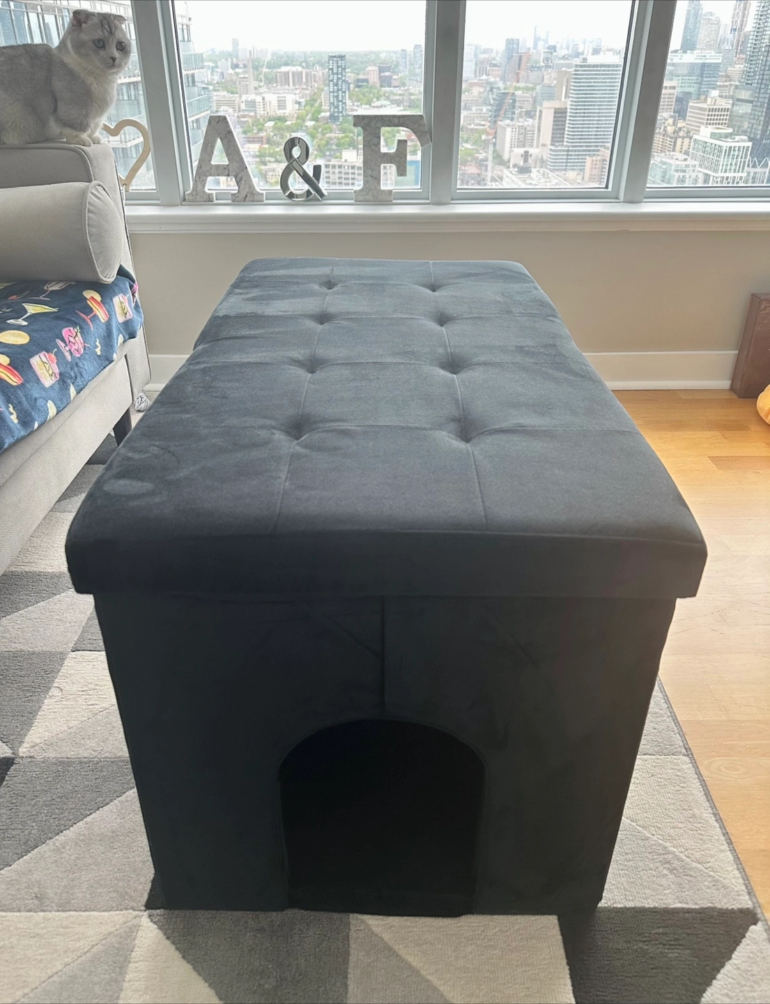 Here is a MEEXPAWS Black Velvet Cat Litter Box Storage Bench where you can store your litter or anything in the back when you open the lid, it has only been used to sit on so practically brand new. Comes with the litter mat, pad and litter scoop brand new. Never used for litter box storage so it is clean and new. Can also be used as a bench or ottoman with storage and measures 36"x20"x20" inches.