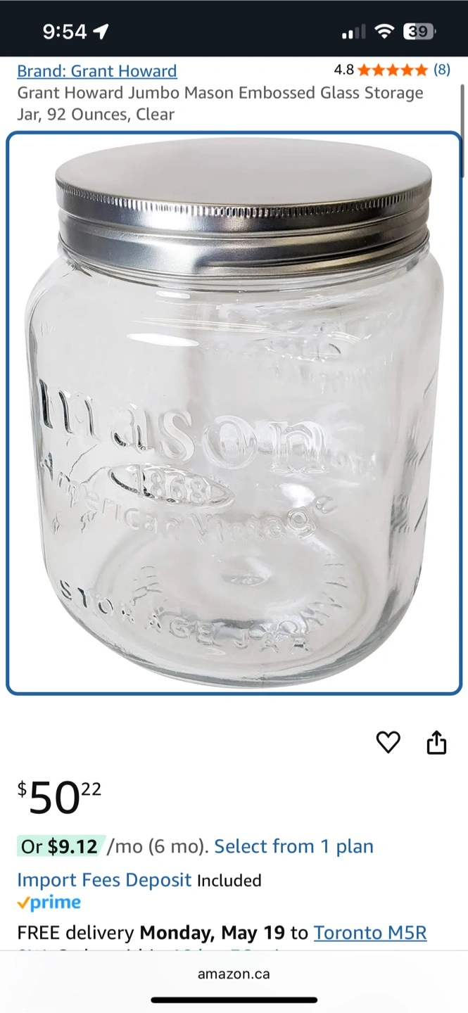 Jumbo Mason Jar, 92 Ounces (3 litres)