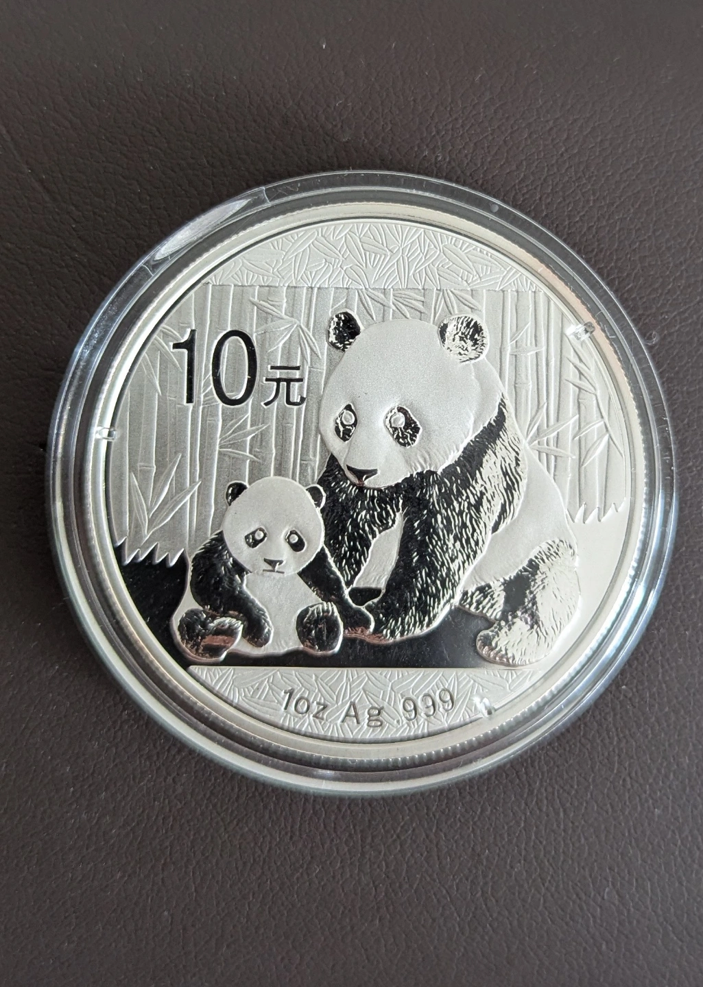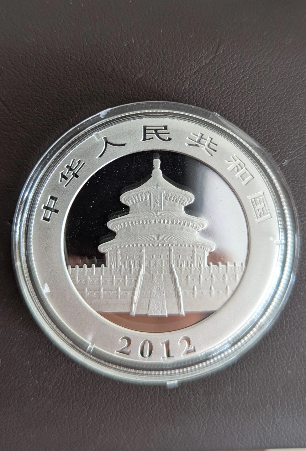 2012 collectable Panda 1 oz pure silver Ag .999 coin. proof mirror strike. One side features the Temple of Heaven, the other side features a panda with her cub. Both encased in their originally sealed plastic capsule. Collectible coins.