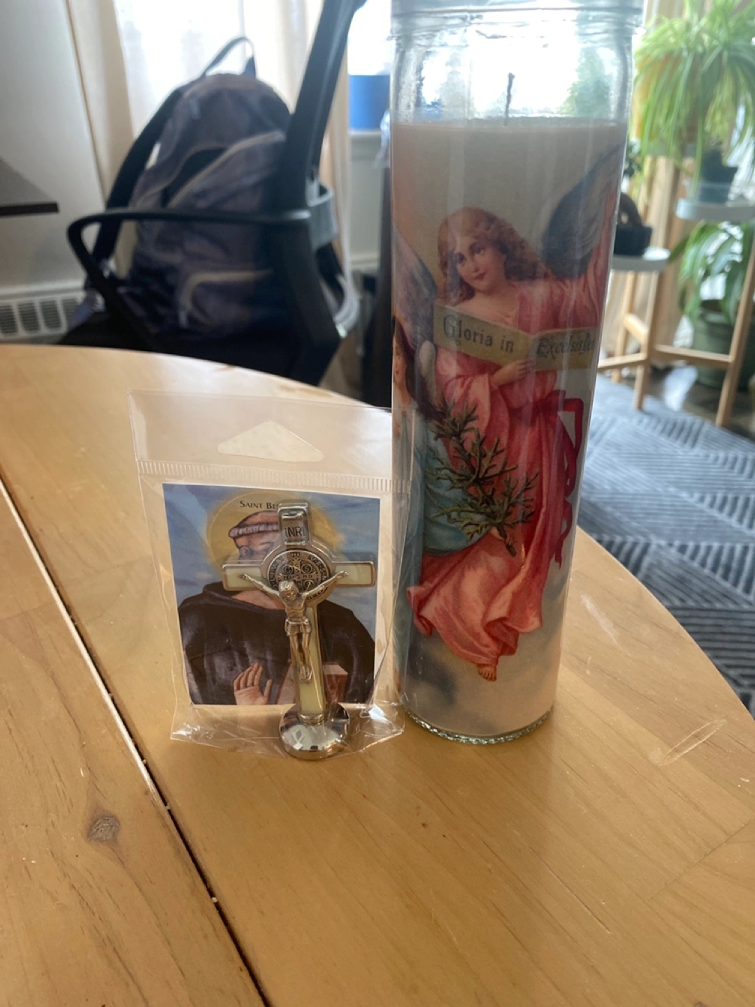 Small tabletop metal crucifix featuring Saint Benedict. Packaged with a prayer card. Includes an angel-themed candle. Perfect for prayer or meditation.