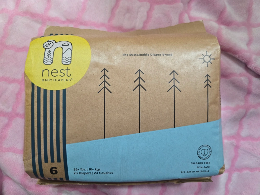 Package of size 6 Nest baby diapers. 23 count. Sustainable and chlorine-free. Bio-based materials. Features absorbent core, soft breathable back sheet, wetness indicator, free of harmful chemicals, and stretchable waistband.