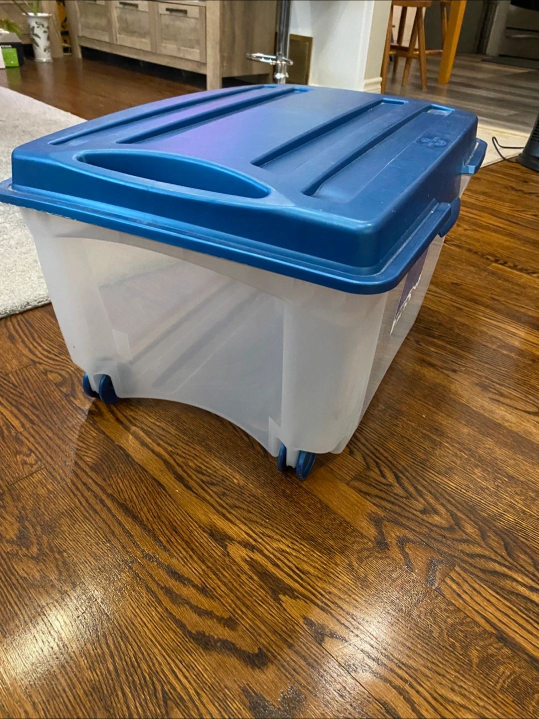 Durable clear plastic storage bin. Blue lid and four wheels. Great for organizing and moving items. Large capacity