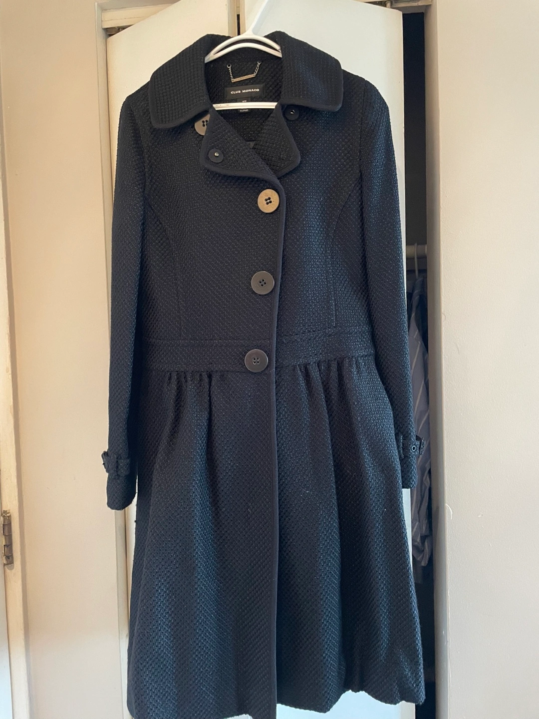 Women's black peacoat. Tweed fabric. Button closure. Long sleeves. A-line silhouette. Size M.