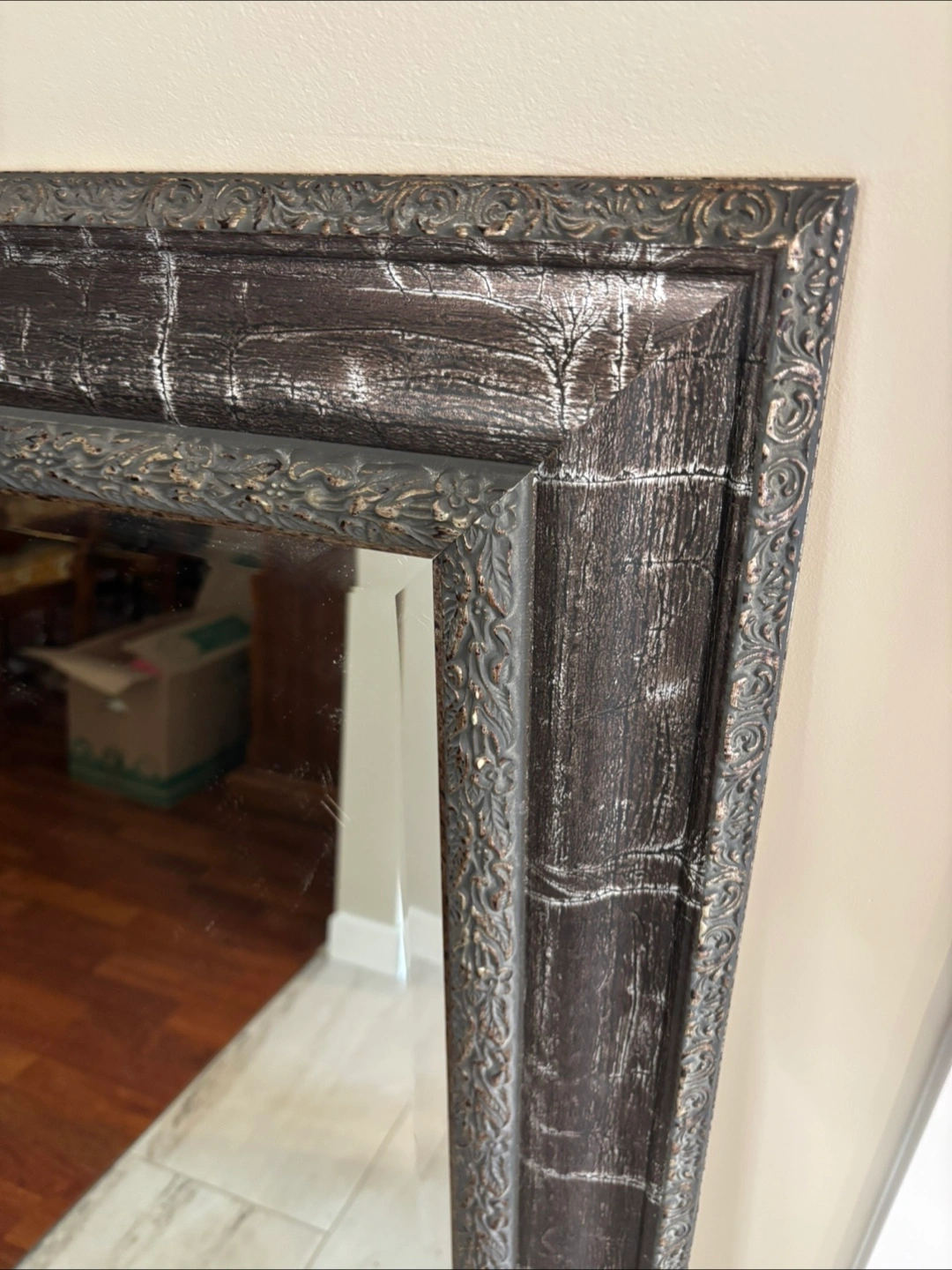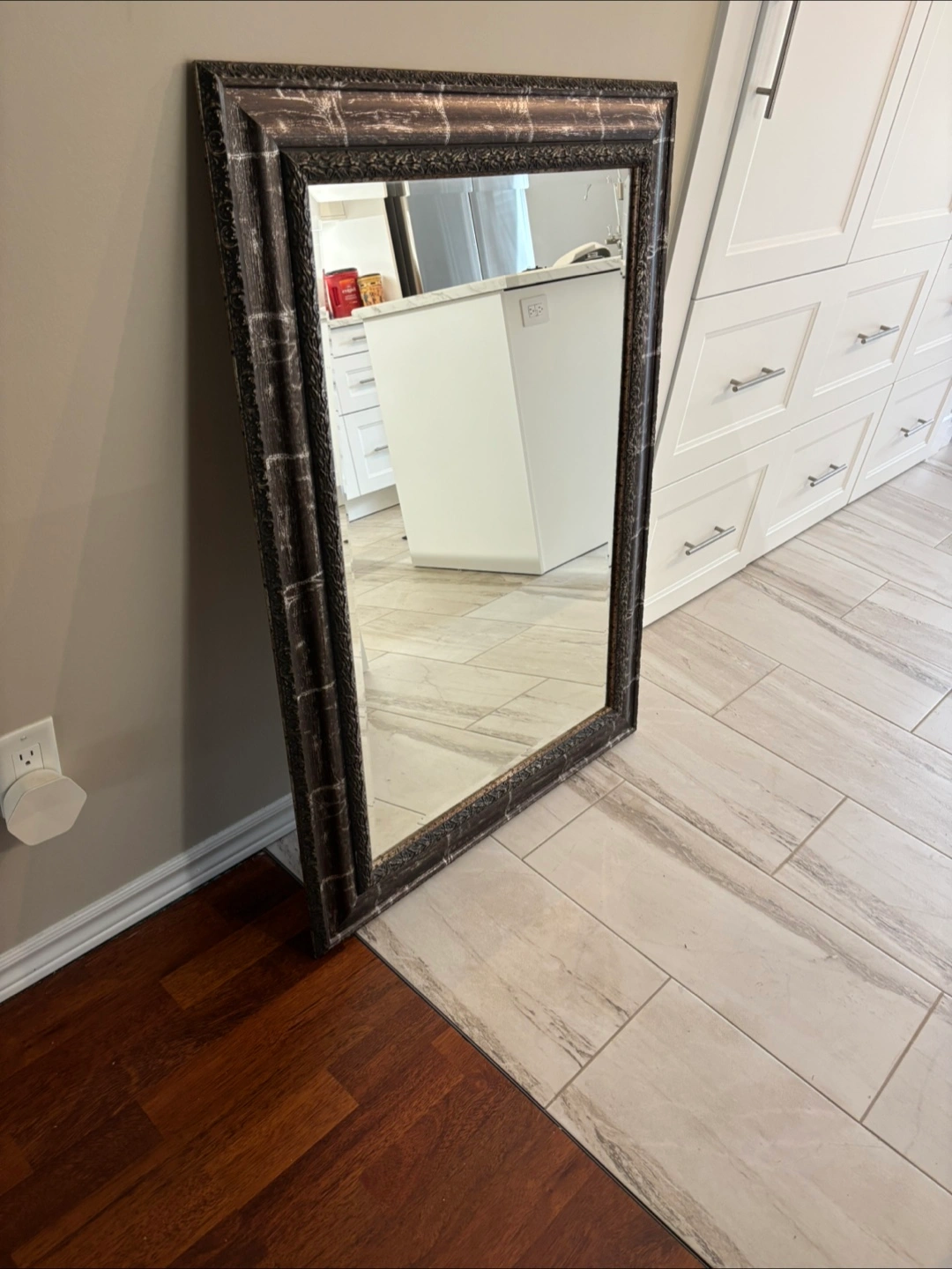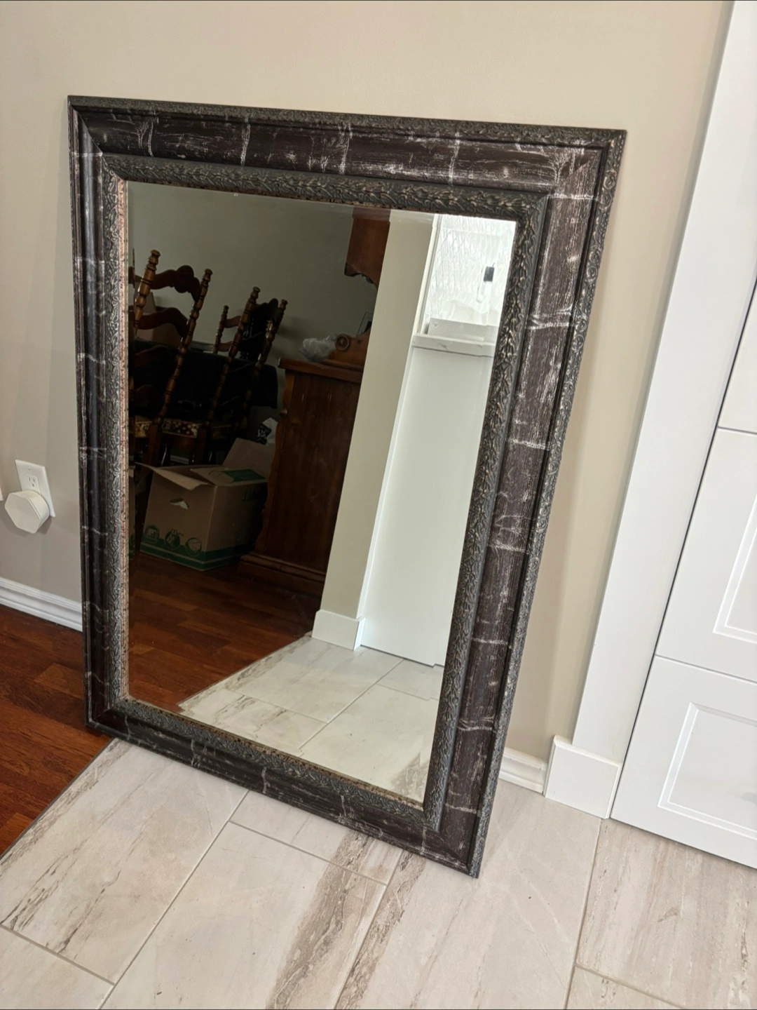 Elegant, large mirror. Dark brown/black frame with ornate detailing. Great for entryway or bedroom. Adds a touch of class to any room. 31 inch by 44 inches Pickup Garth street & Twenty road 🏒