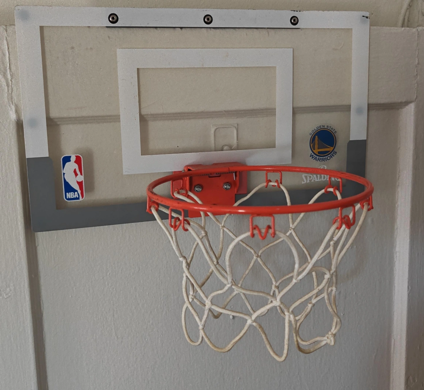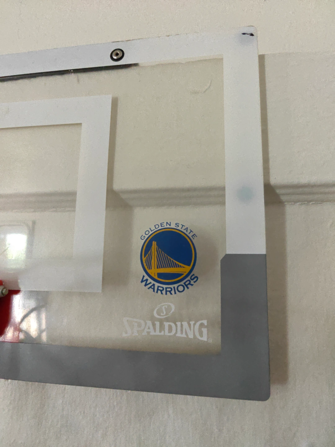 Miniature basketball hoop. Features Golden State Warriors and NBA logos. Red rim, white net. Mounts on door or wall.