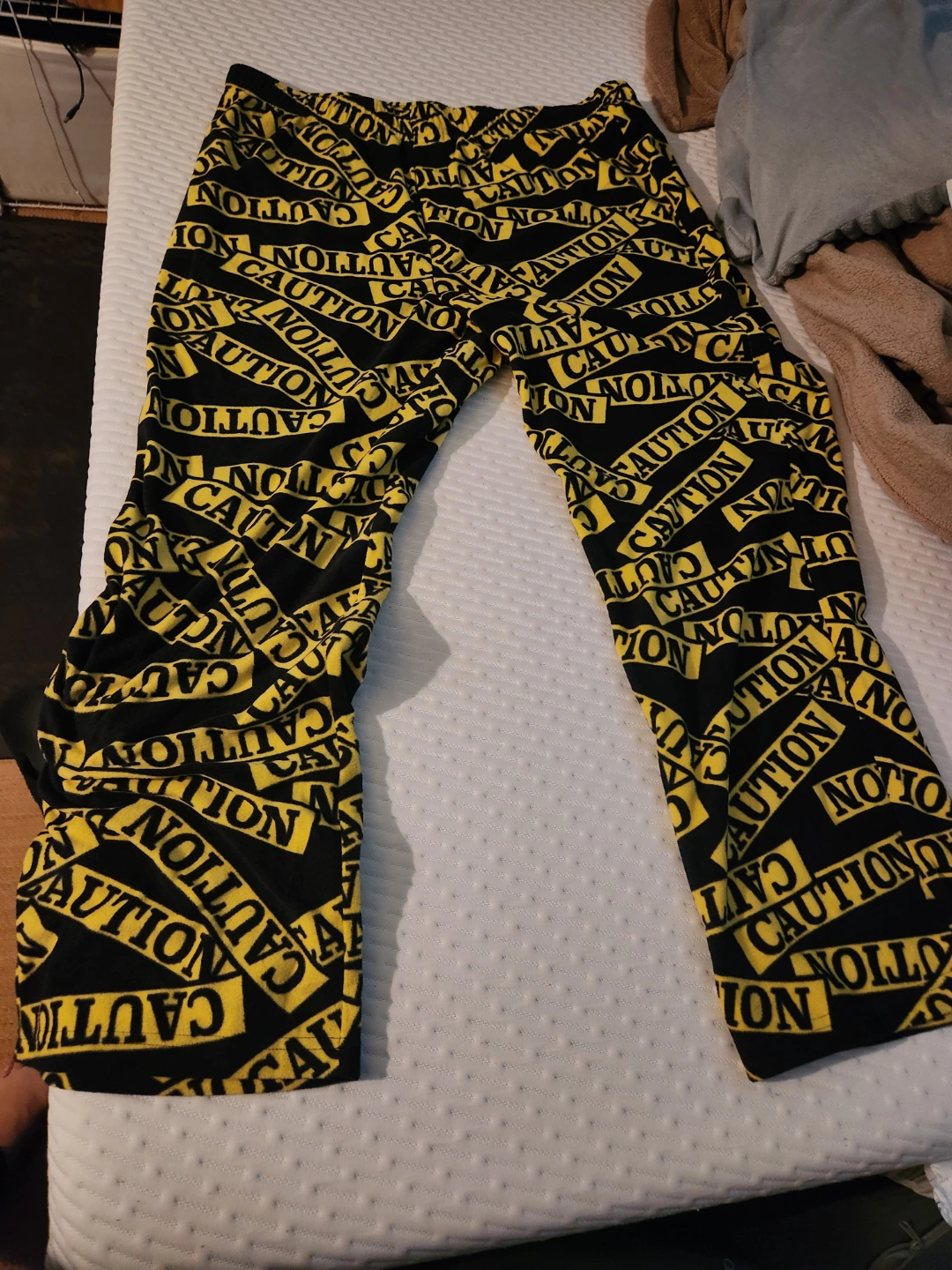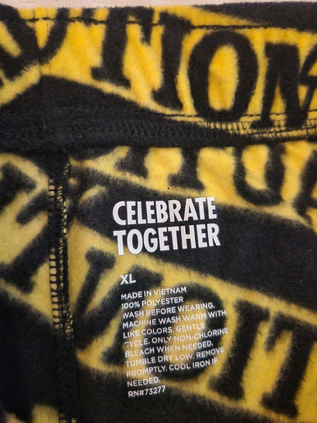 Black fleece pajama pants. XL. Yellow caution tape print. Made in Vietnam. 100% Polyester. Machine wash.
