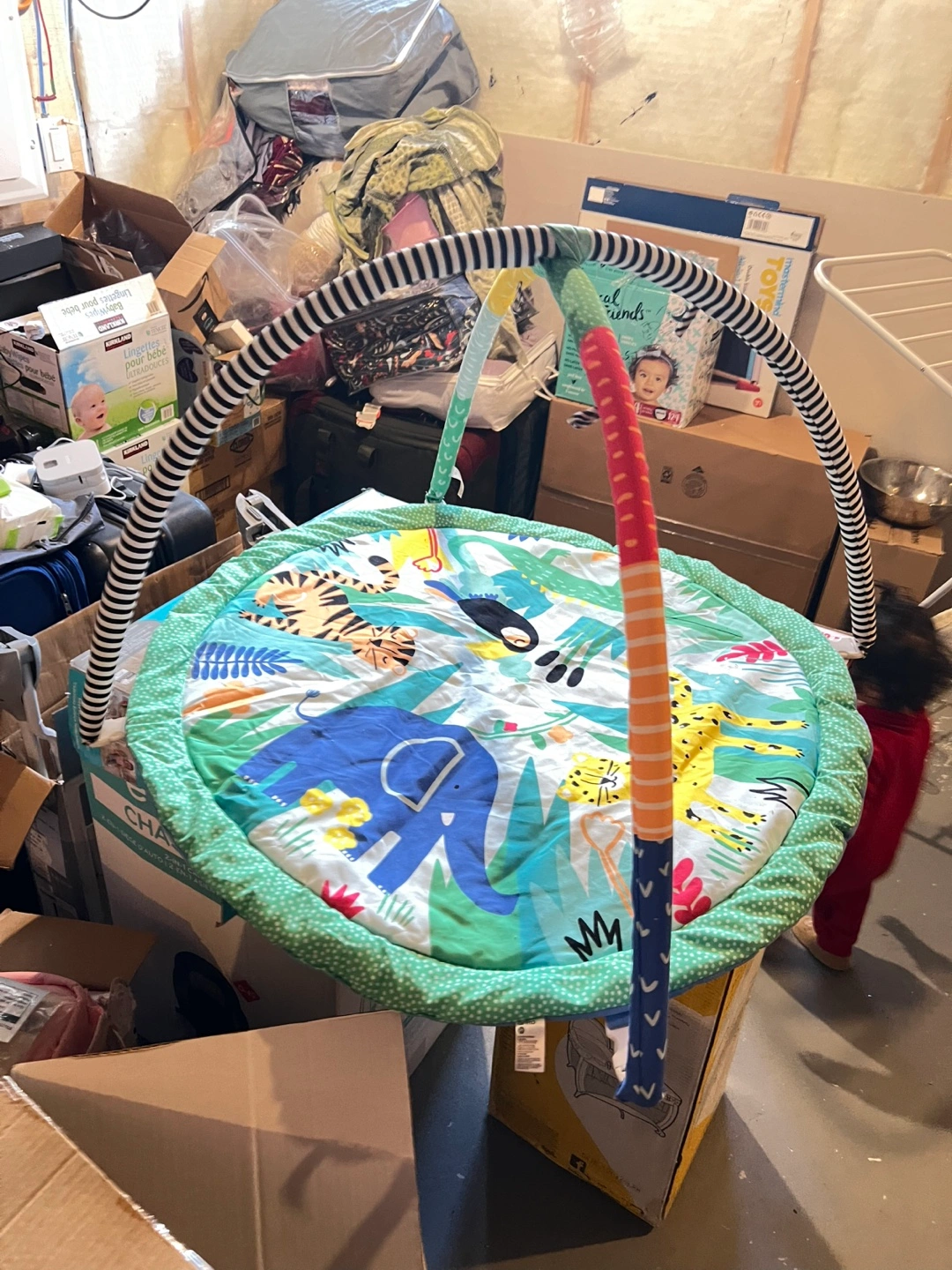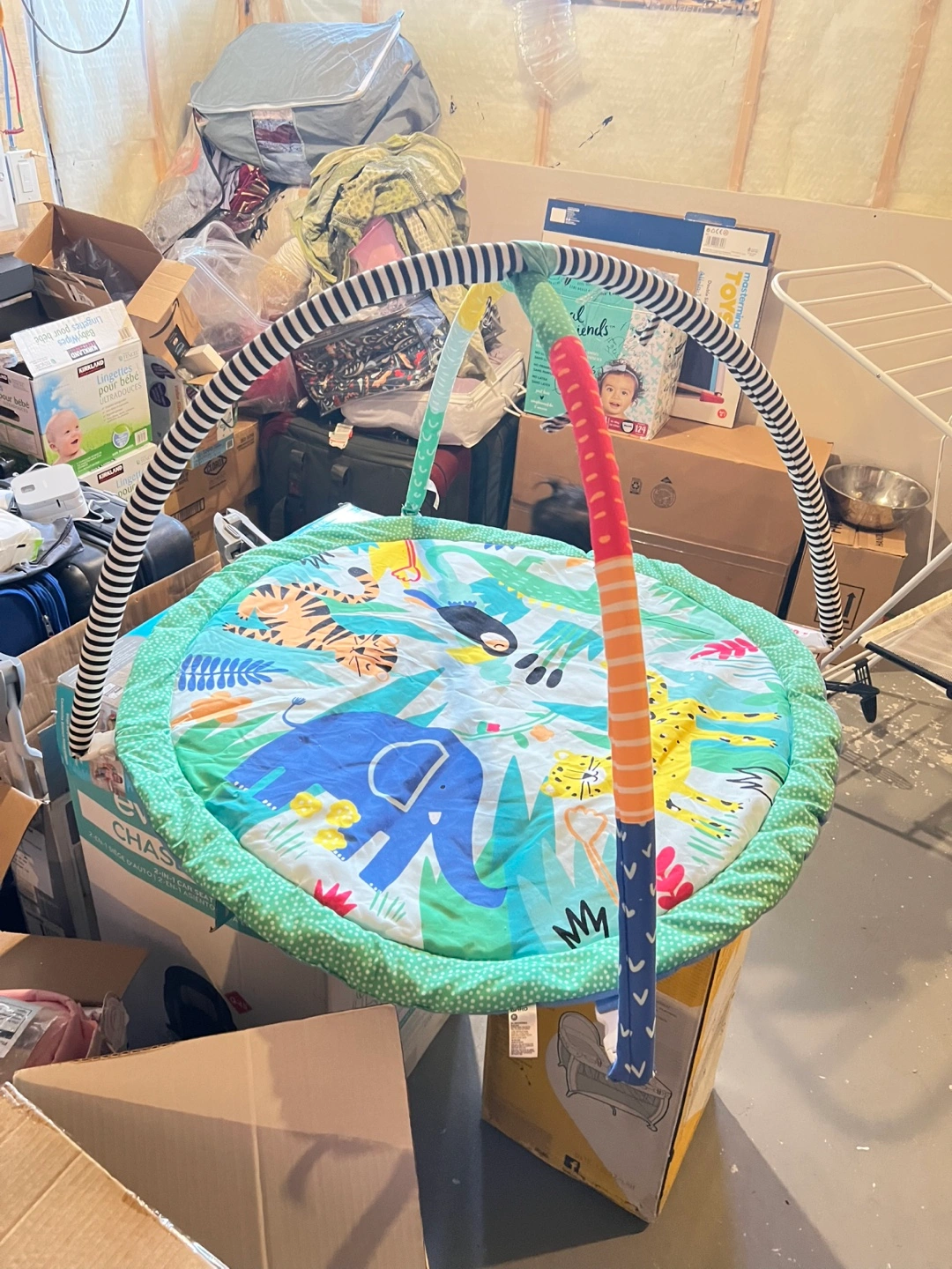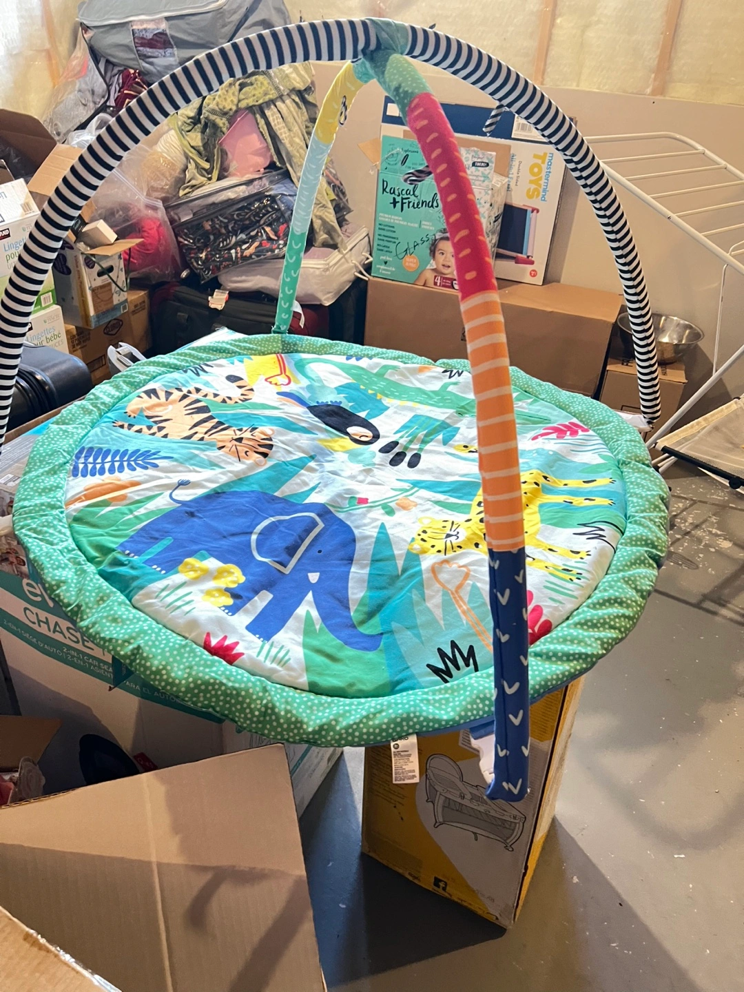 Adorable baby playmat featuring a jungle animal theme. Soft, colourful design. Includes a flexible arch for hanging toys (toys not included). Great for tummy time and playtime.