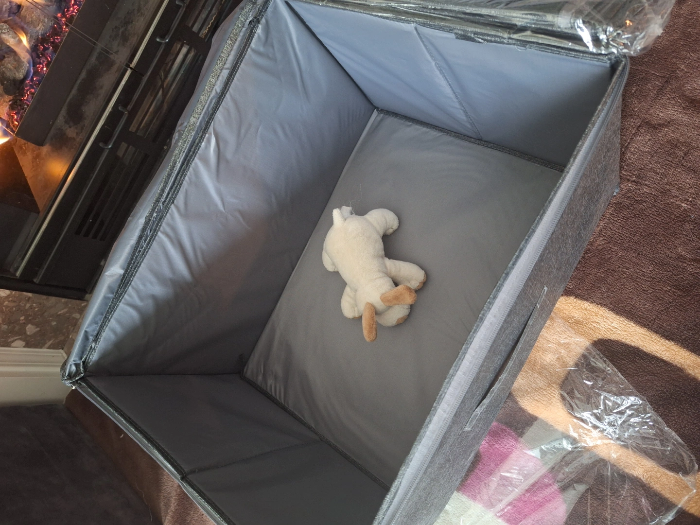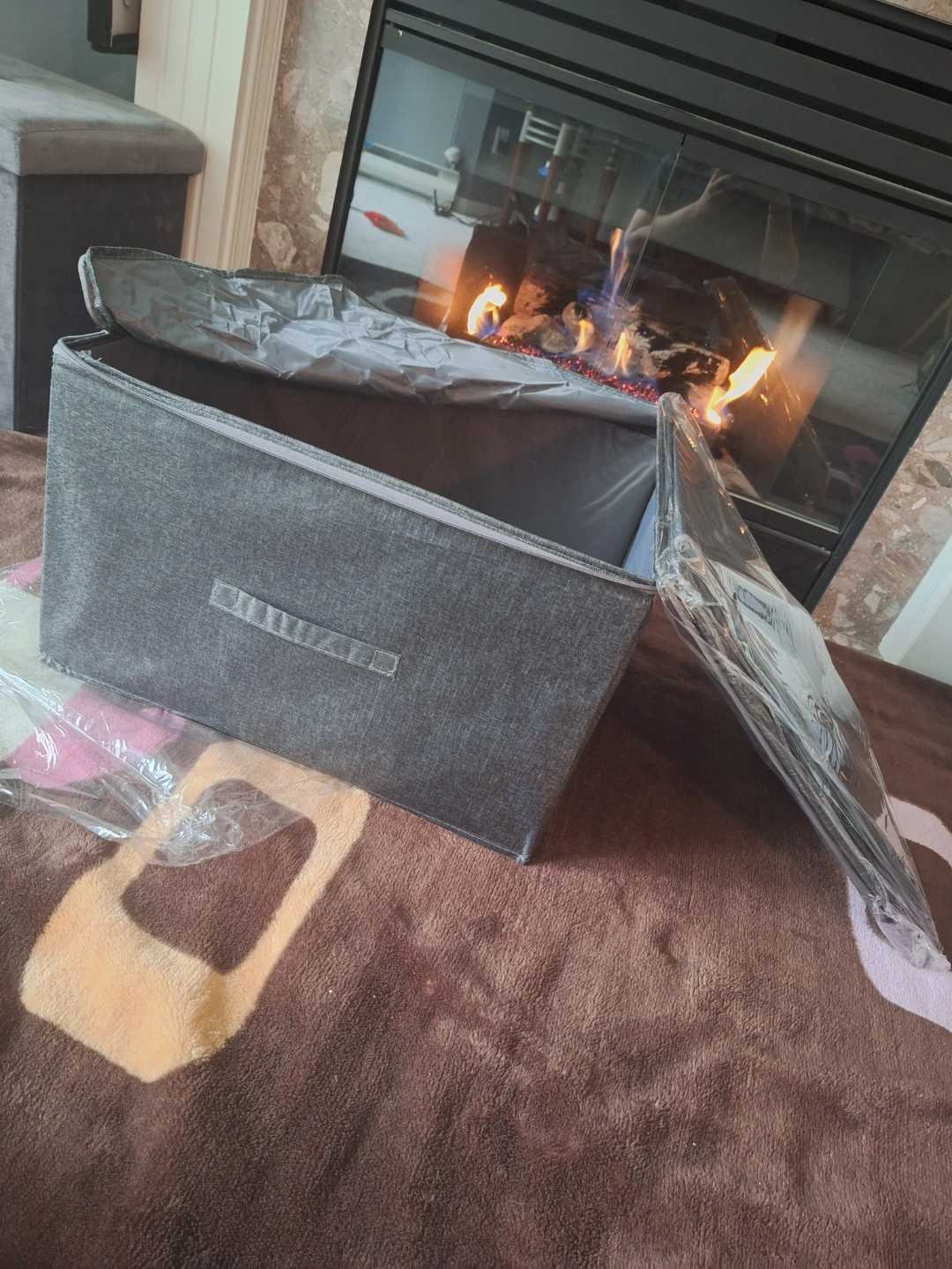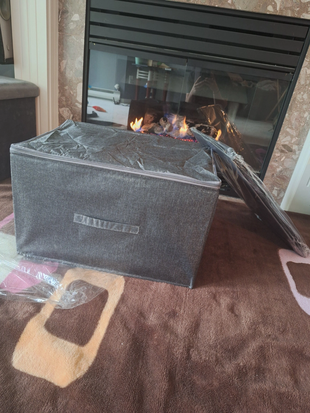 Grey fabric storage bin, zipper closure, collapsible. Measures approximately 19.29" x 14.57" x 12.2". Perfect for organizing clothes, toys, or other items. Durable and lightweight.