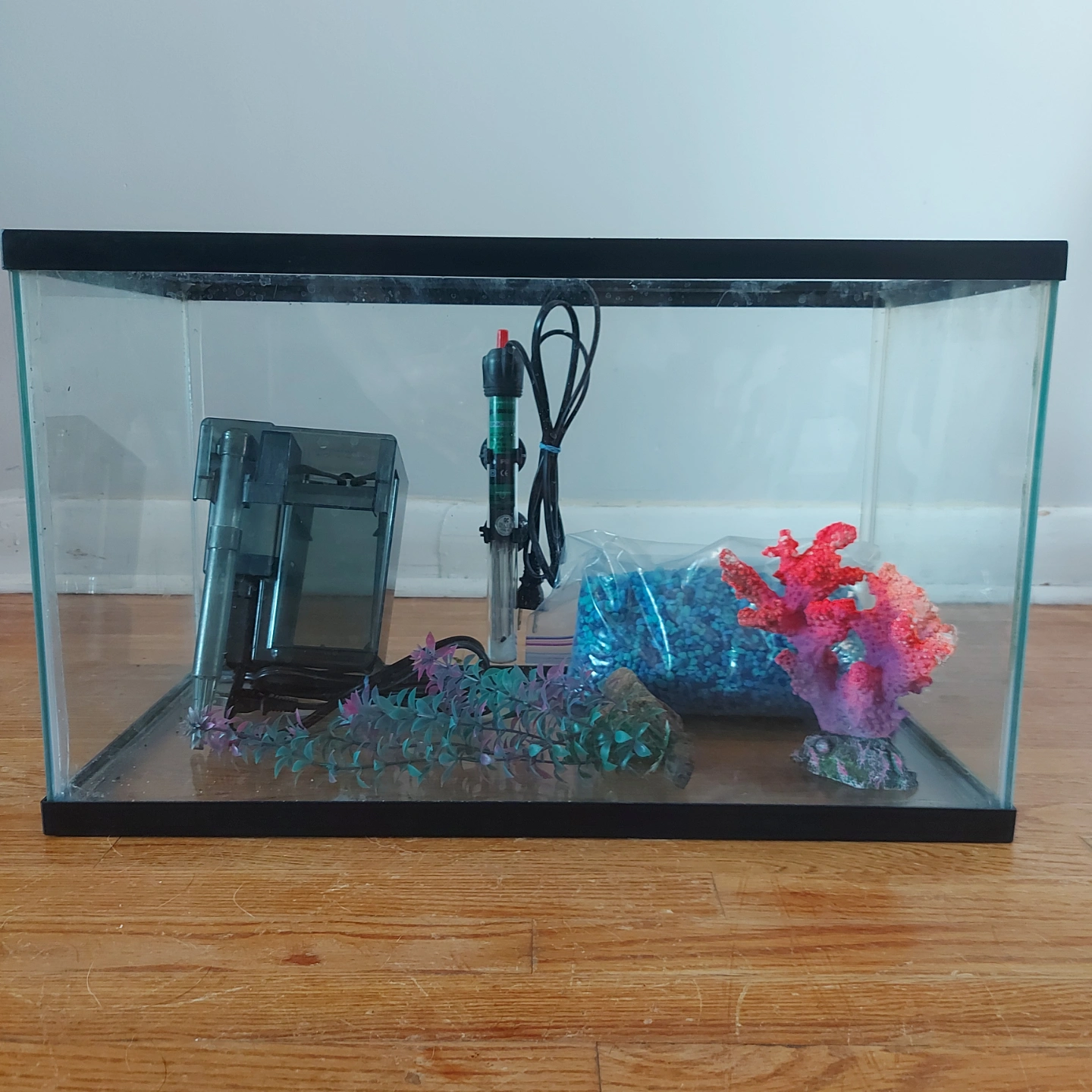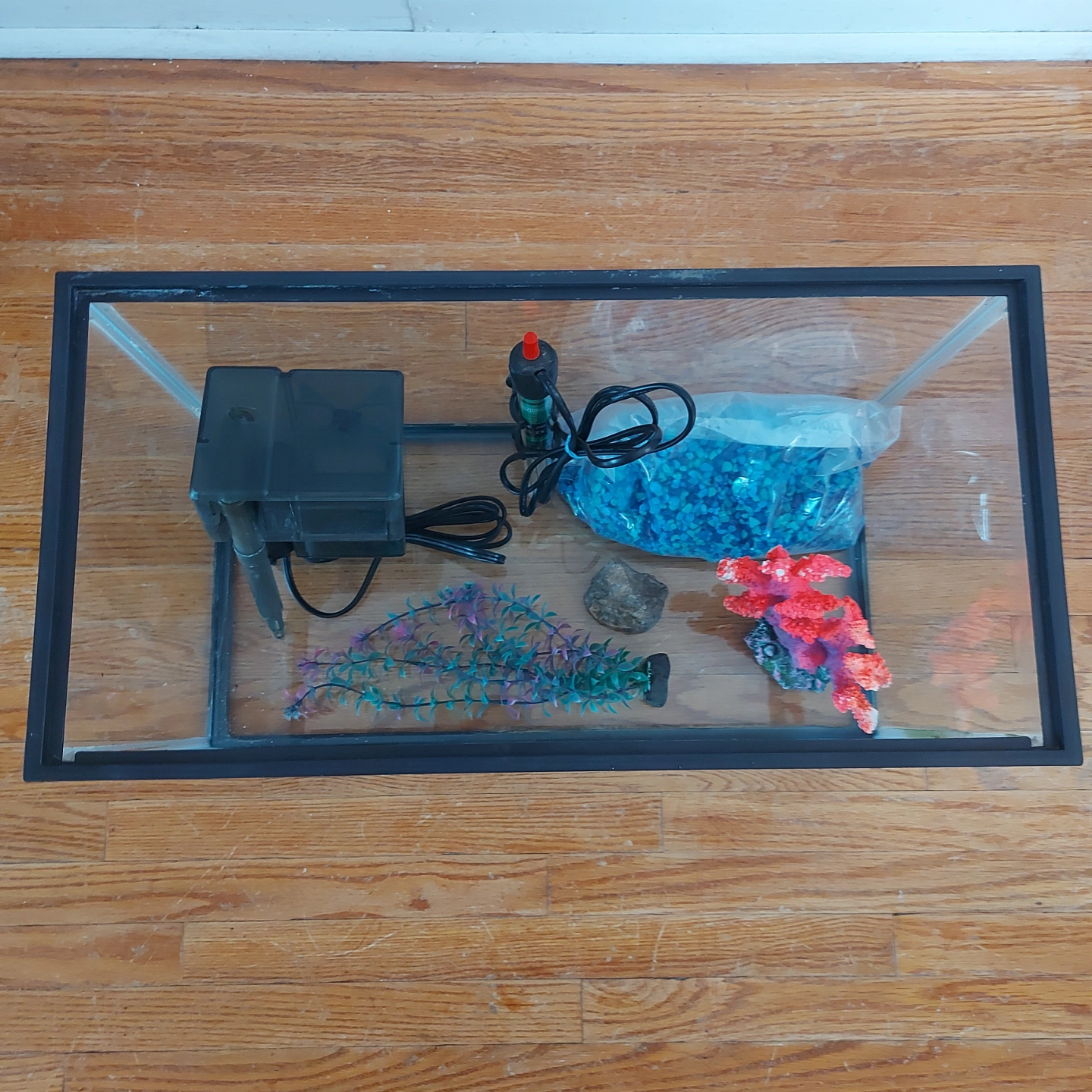 1000+Check out my other listings for even more unique finds! Fish Tank Starter Kit - 10 Gallon Aquarium This is a complete fish tank starter kit, perfect for beginners! It comes with everything you need to set up a thriving underwater environment. The kit includes a filter to keep the water clean, a heater to maintain the perfect temperature, decorative plants, vibrant blue gravel, and a coral ornament to add a splash of color. This is a used kit, but is in good condition and ready for a new home. Kit Includes: * 10-gallon glass aquarium * AquaClear Filter * Uniclife 100W Heater * Decorative plants * Blue gravel * Coral ornament Measurements: L: 51cm / 20in W: 26cm / 10in H: 30cm / 12in + 1 surprise! --- Special Offer: Bundle this item with other items from my listings for amazing discounts! Pickup Only: Item is available as long as the listing is visible. Delivery is not possible.