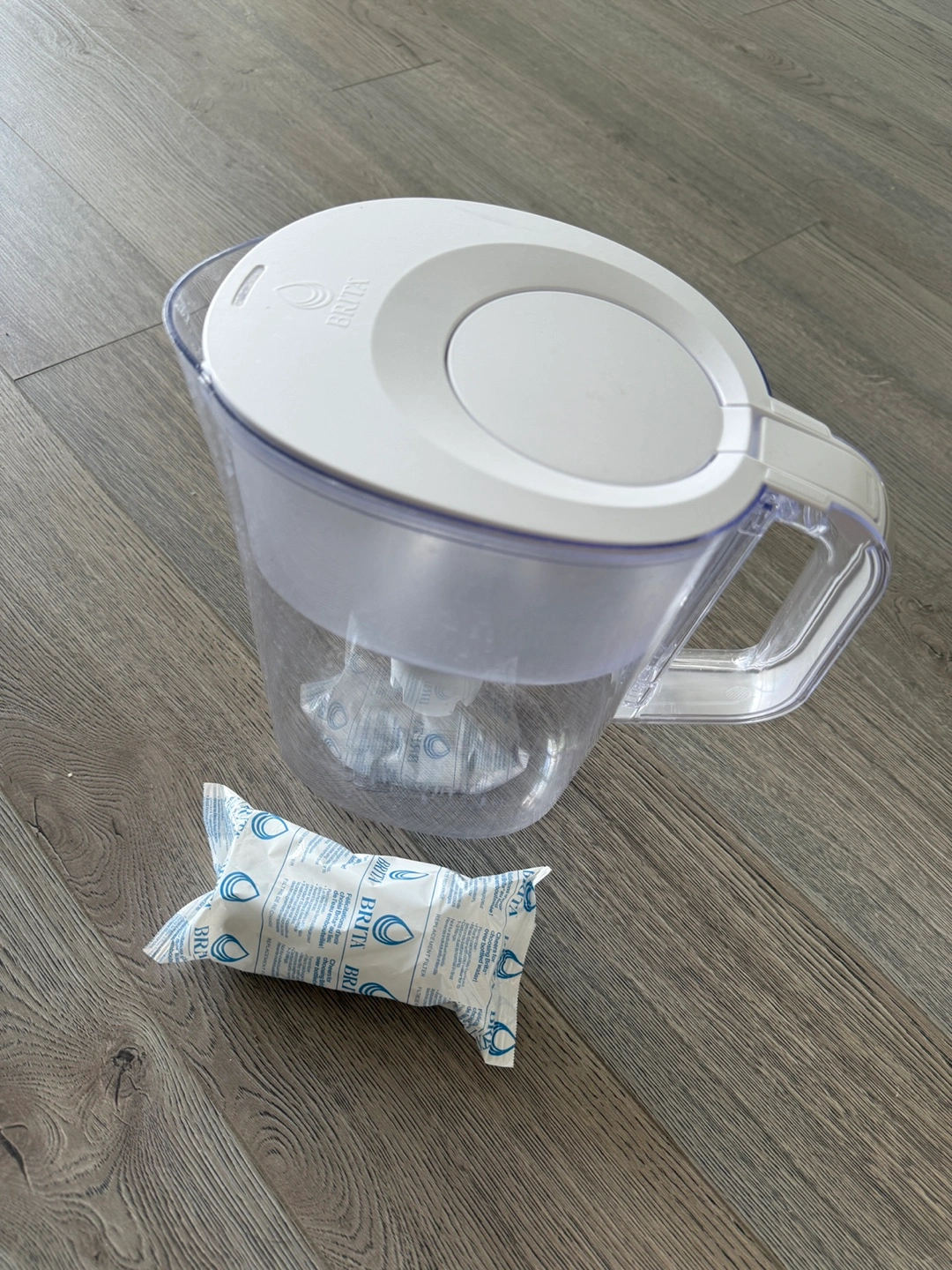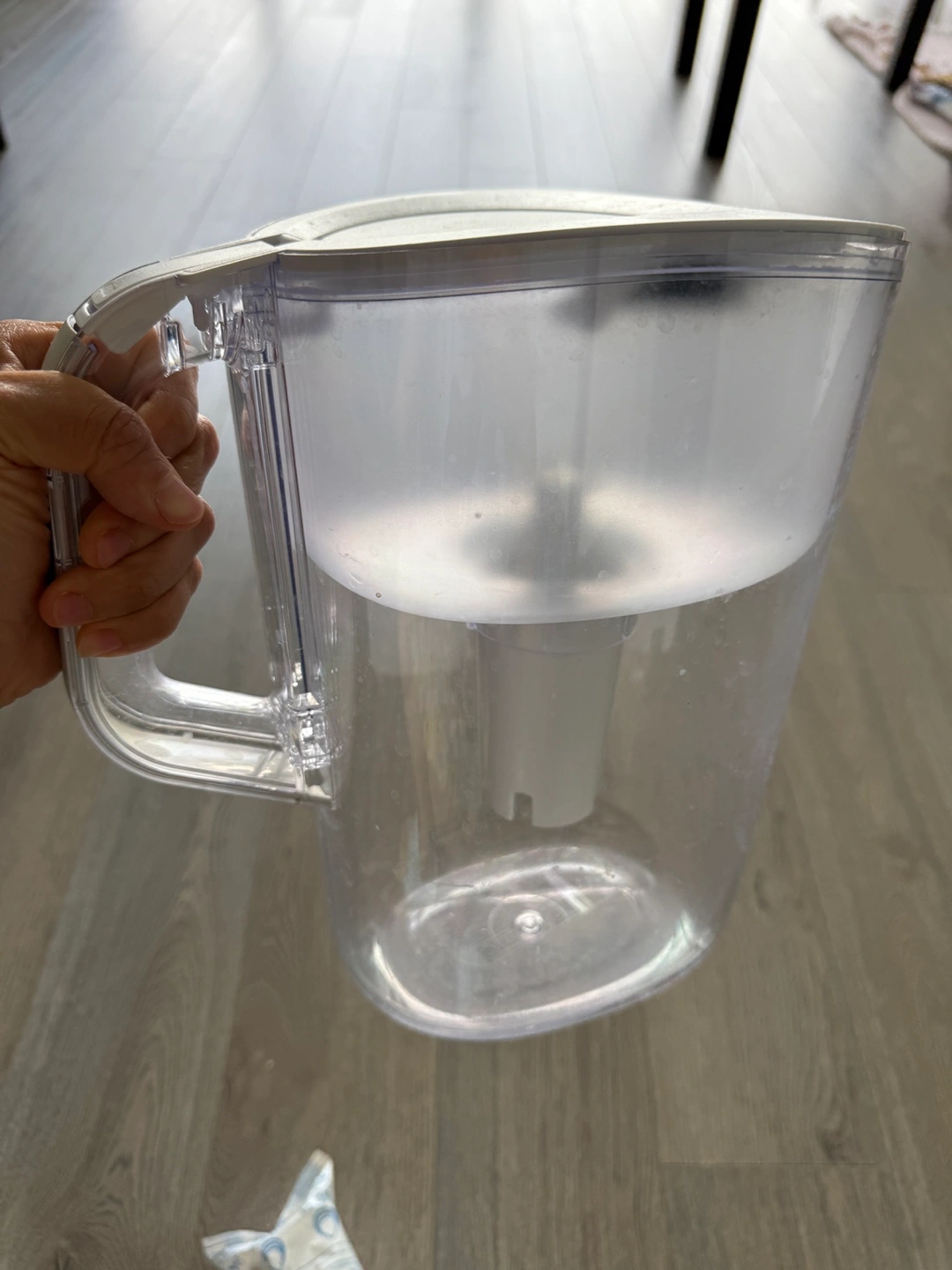 Large capacity water filter pitcher. Includes one extra filter. Clear plastic with a white lid. Good condition.