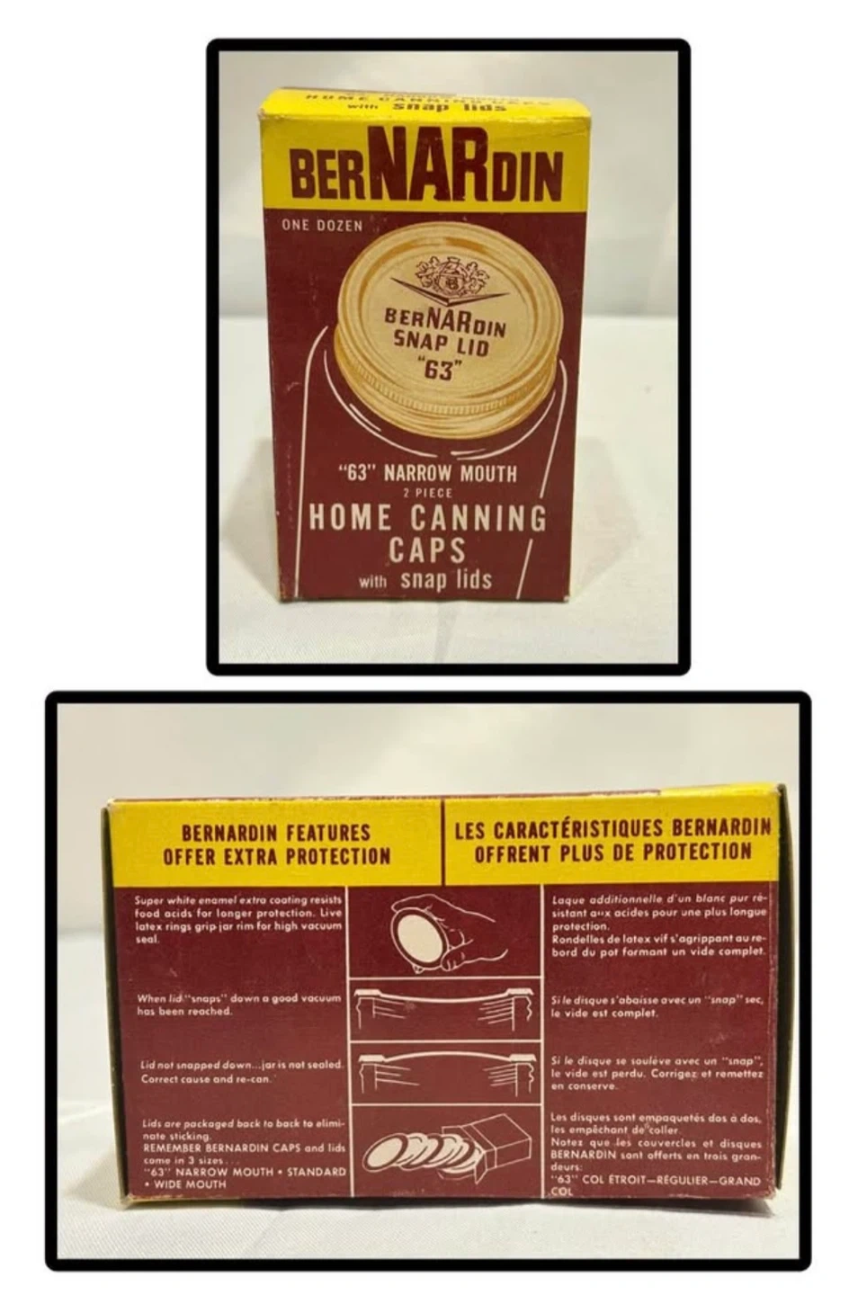 This is a box of one dozen Bernadin "63" narrow mouth home canning caps with snap lids. They feature a super white enamel extra coating to resist food acids and live latex rings for a high vacuum seal. Lids are packaged back to back to prevent sticking.