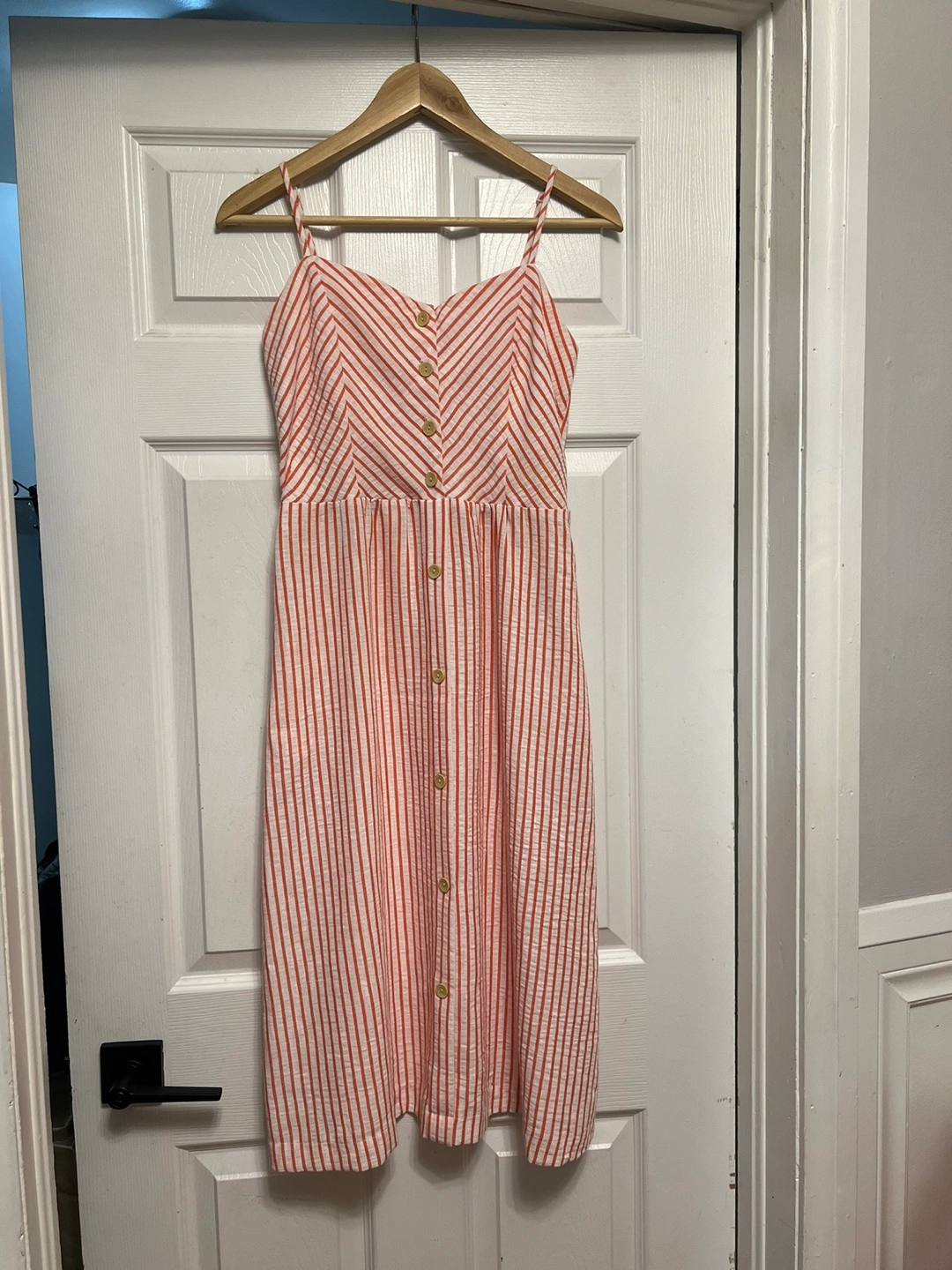 374Orange and white striped midi dress. Features thin straps and a button-front closure. Lightweight fabric. Perfect for summer.