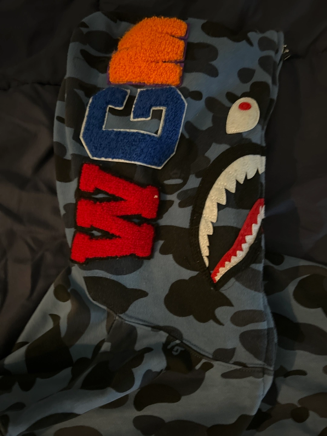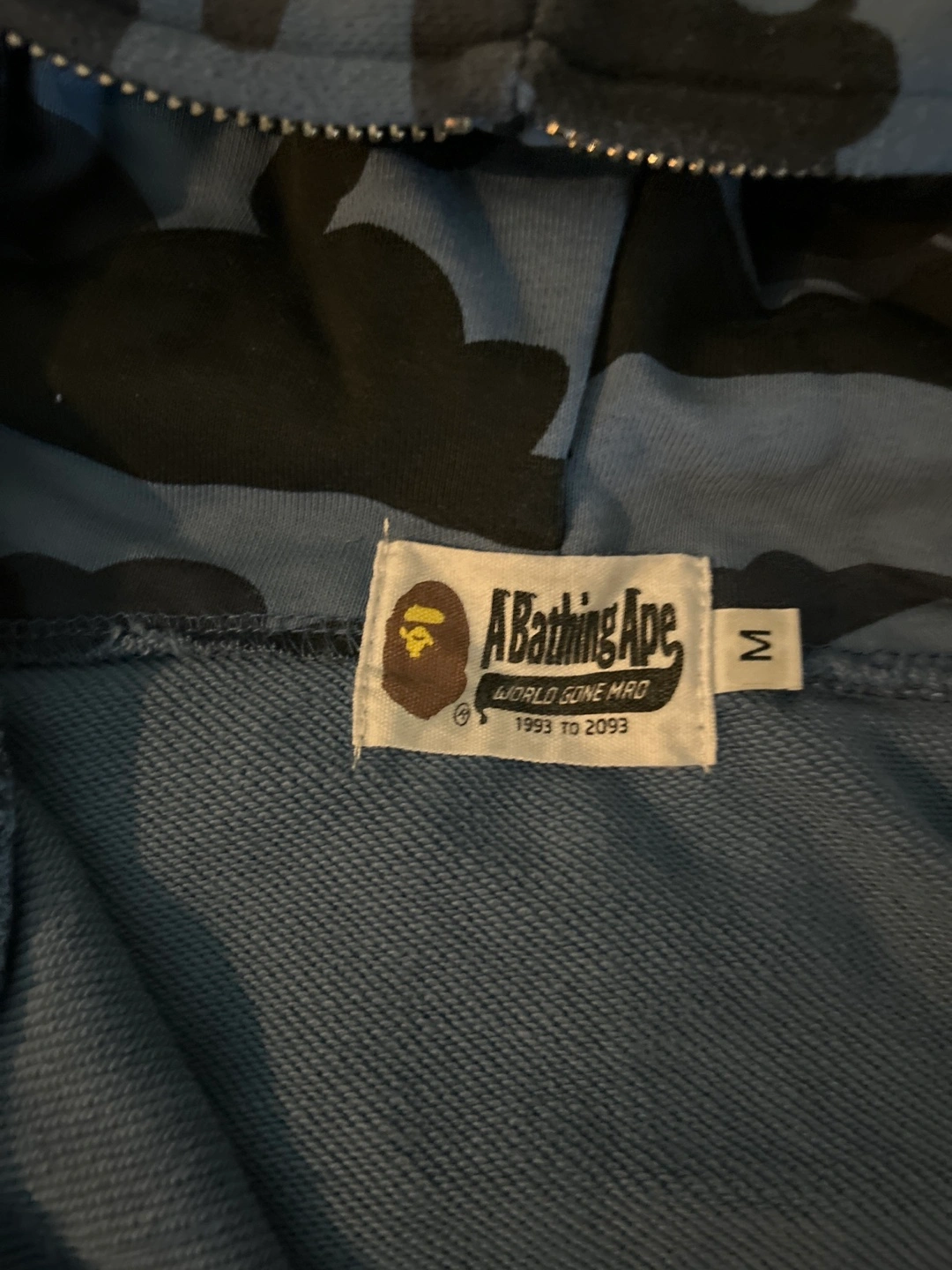 Men's size medium A Bathing Ape zip-up hoodie. Features a blue camo print and a shark head design on the hood. World Gone Mad collection. Excellent condition.