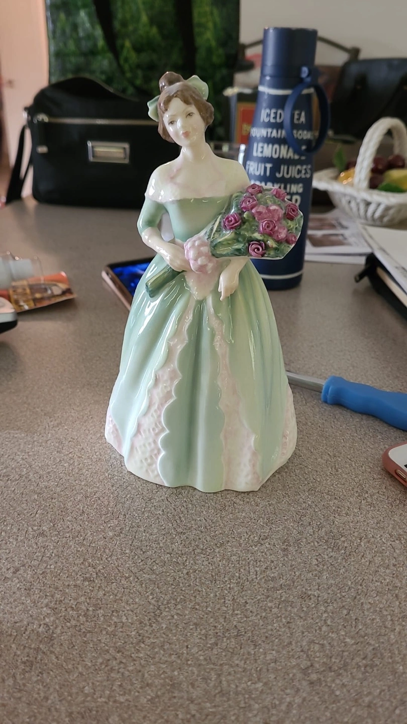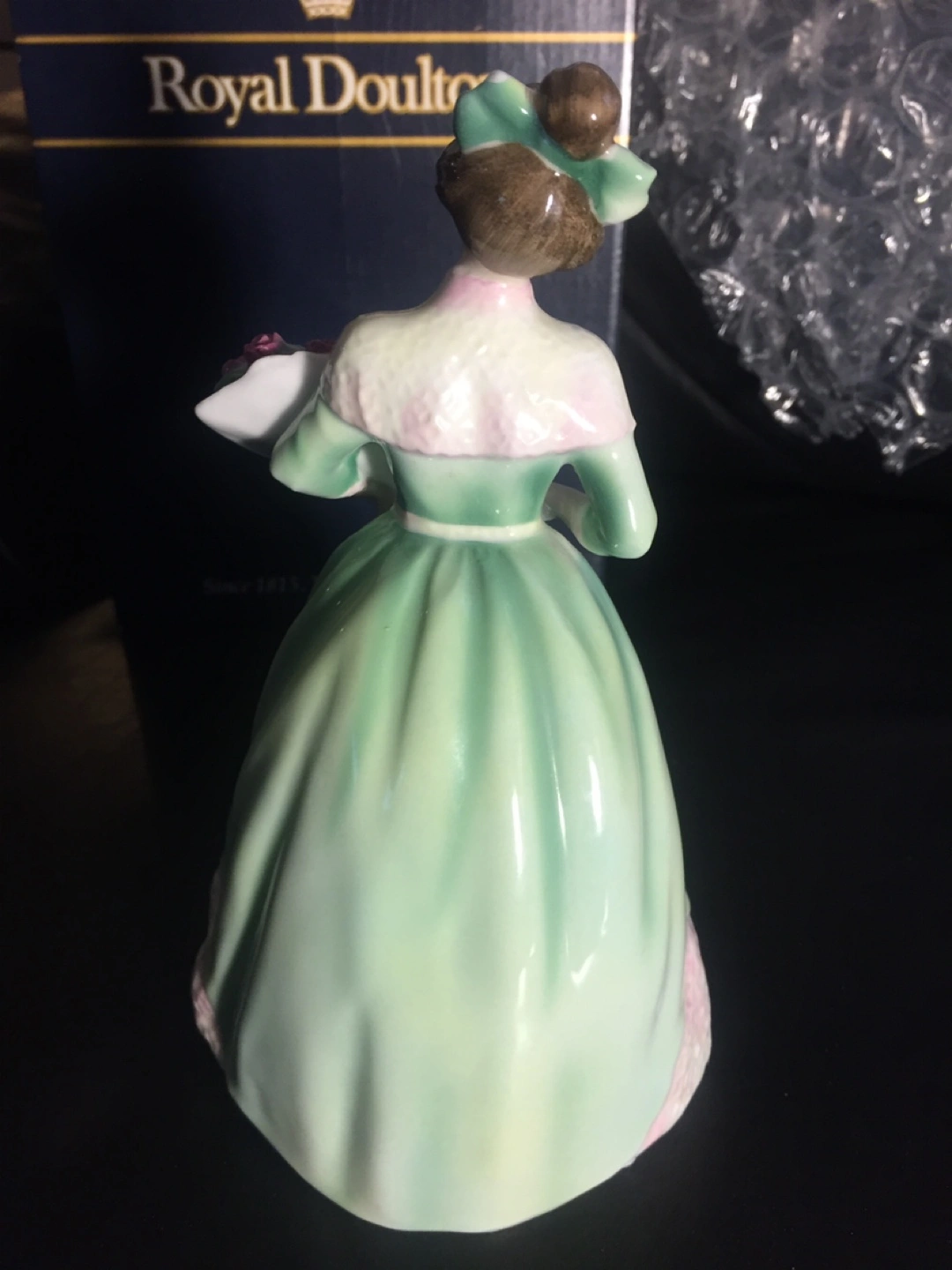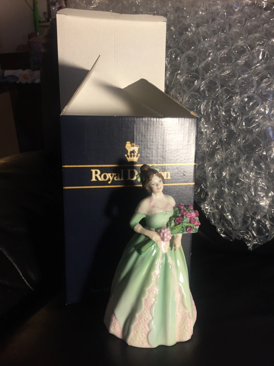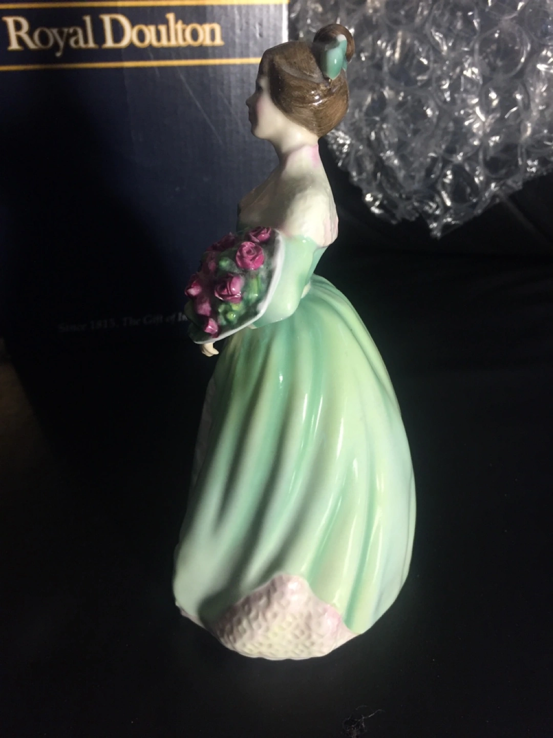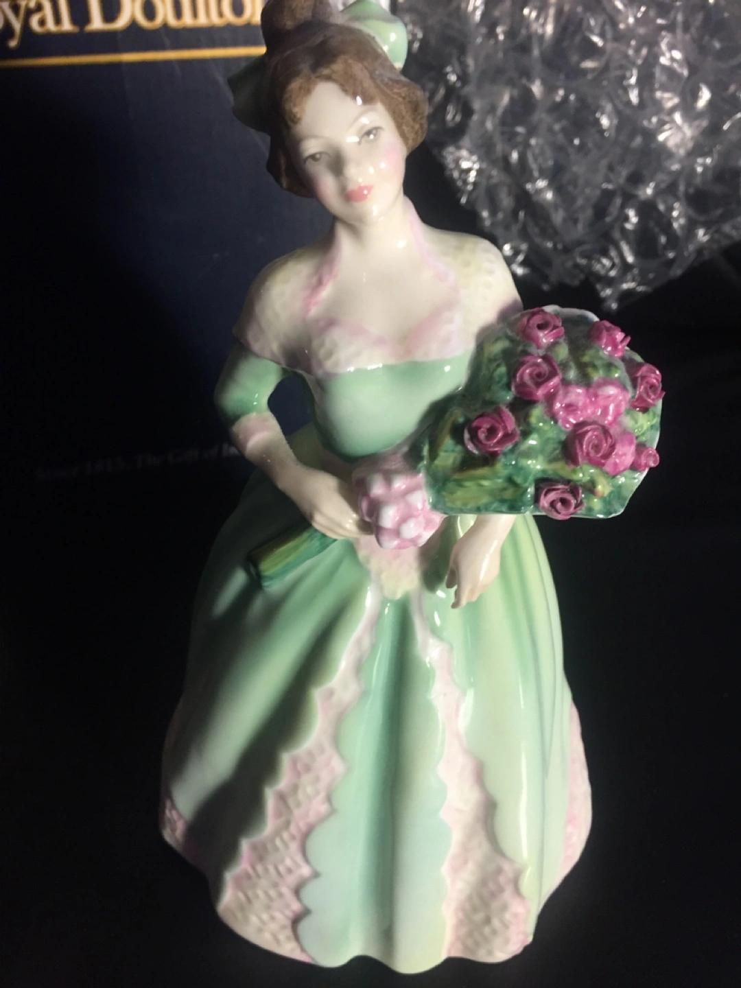 Beautiful Royal Doulton figurine. Lady in a green dress holding a bouquet of flowers - figurine name Happy Birthday. Comes in original box. Collectible item.