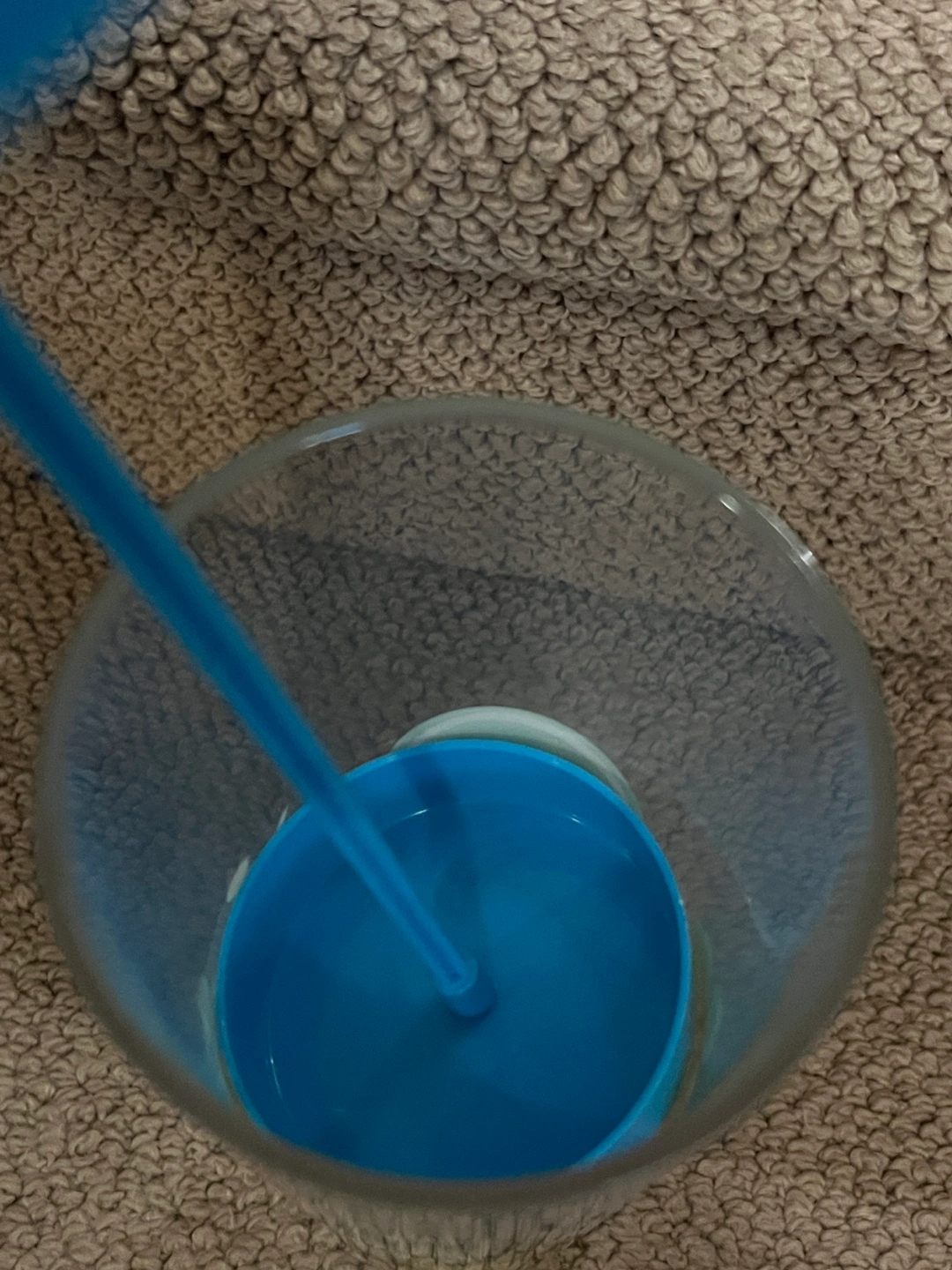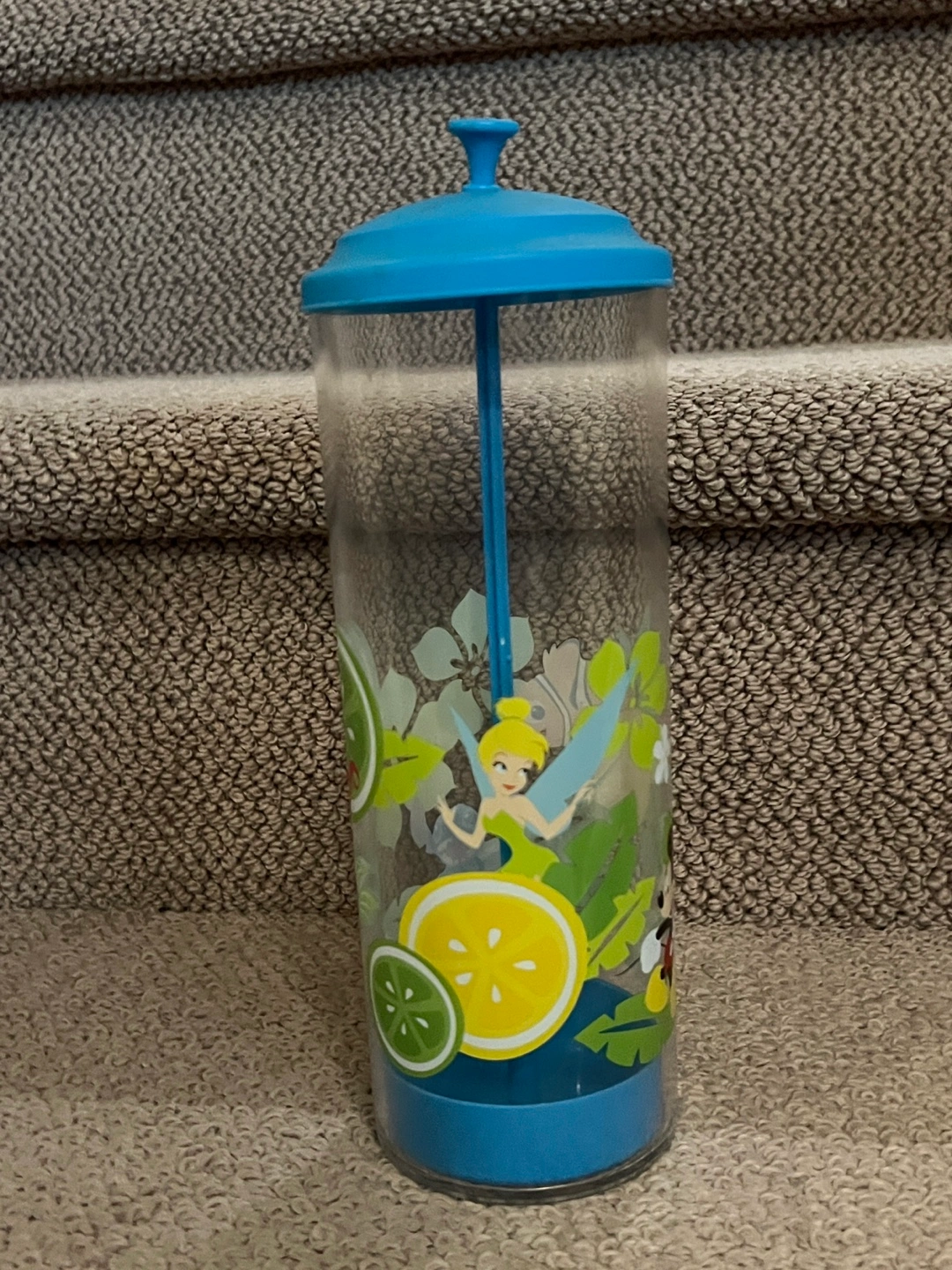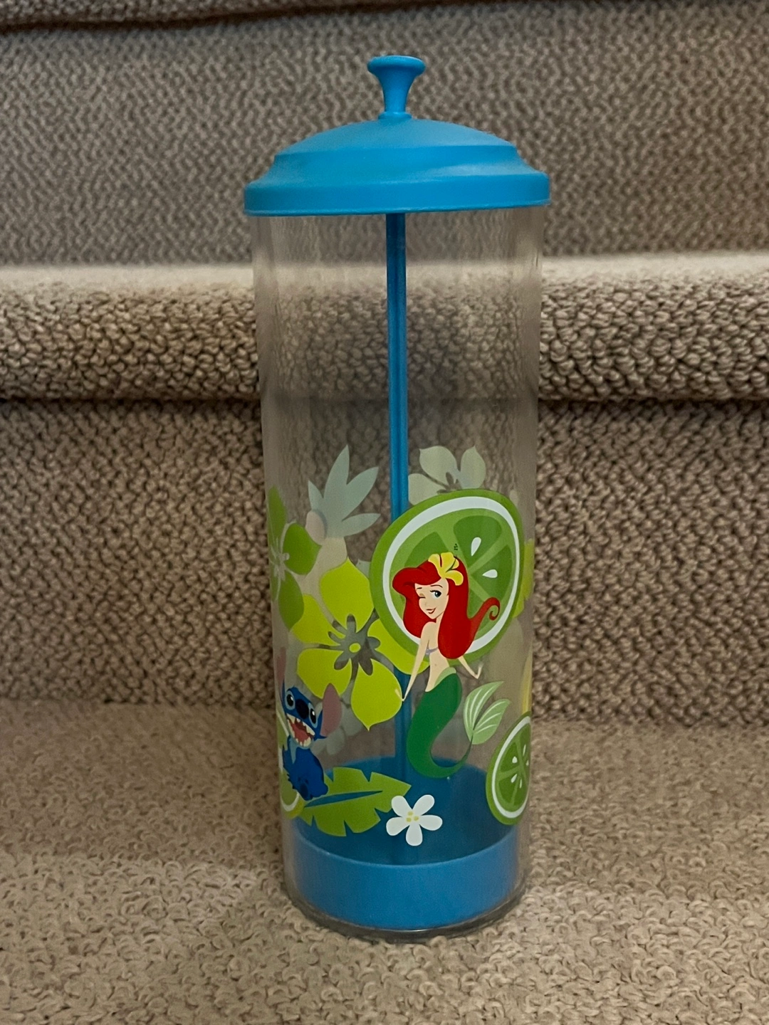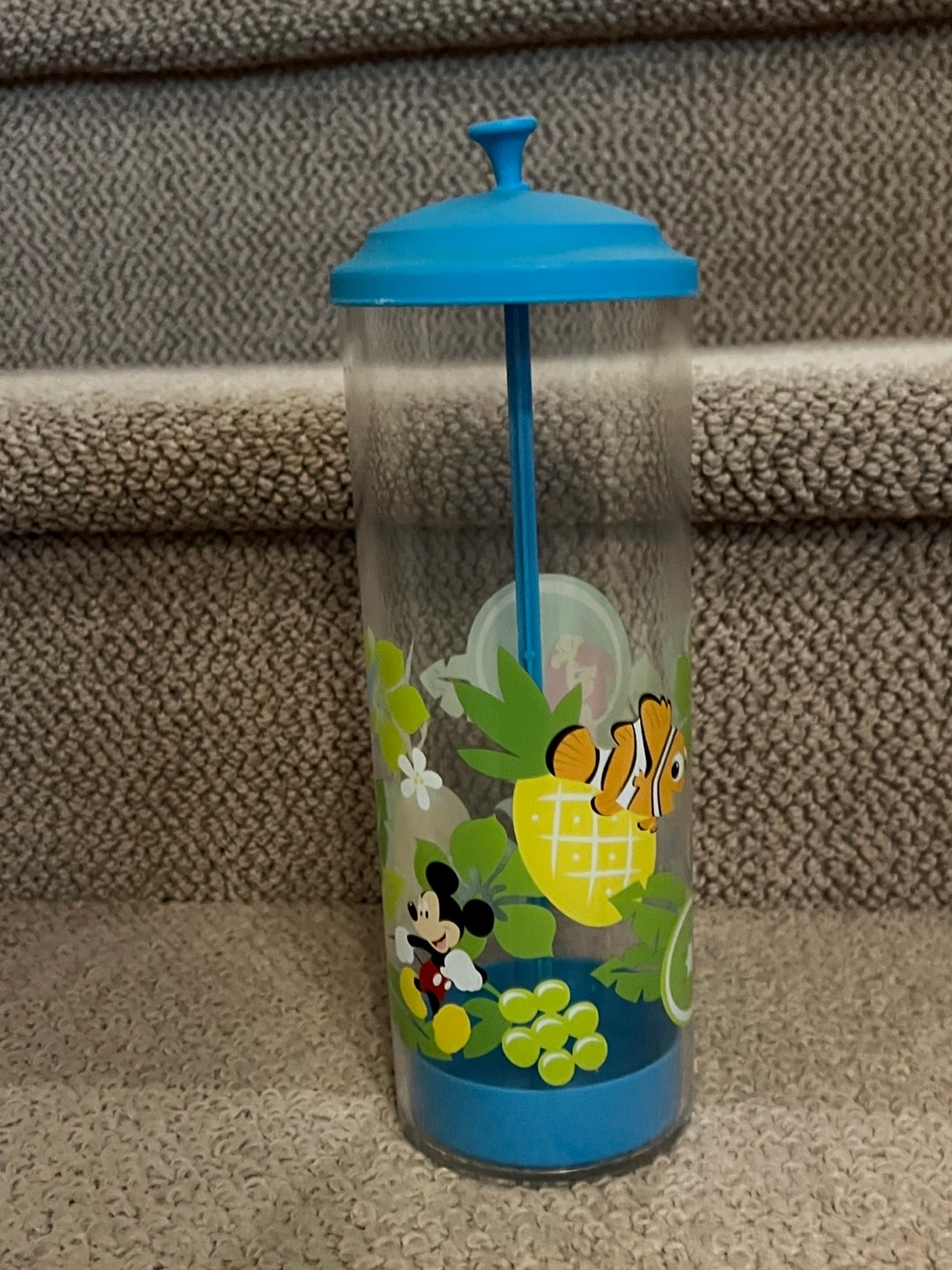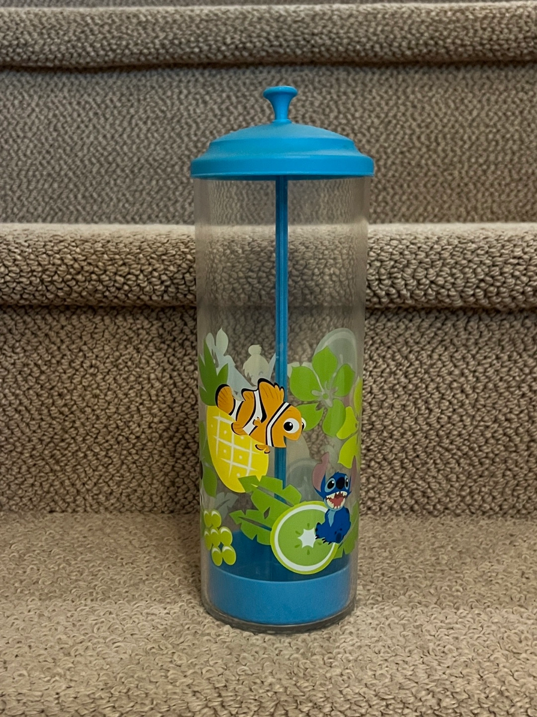 Clear plastic straw dispenser. Features a blue lid and base. Disney characters and tropical designs adorn the sides. Includes a built-in straw holder.