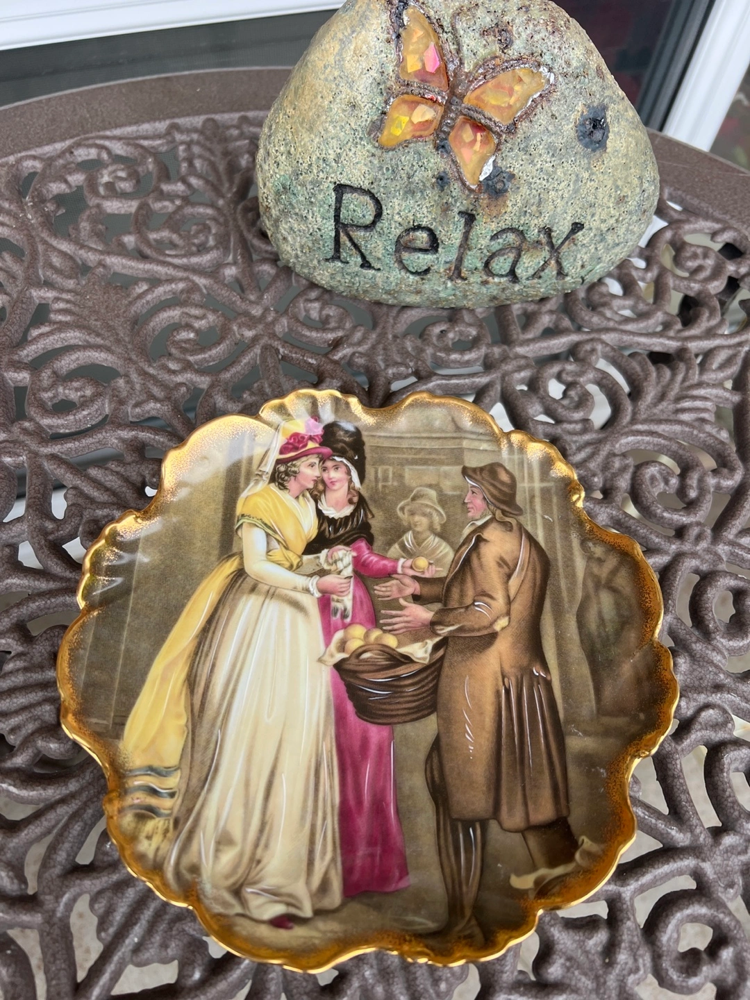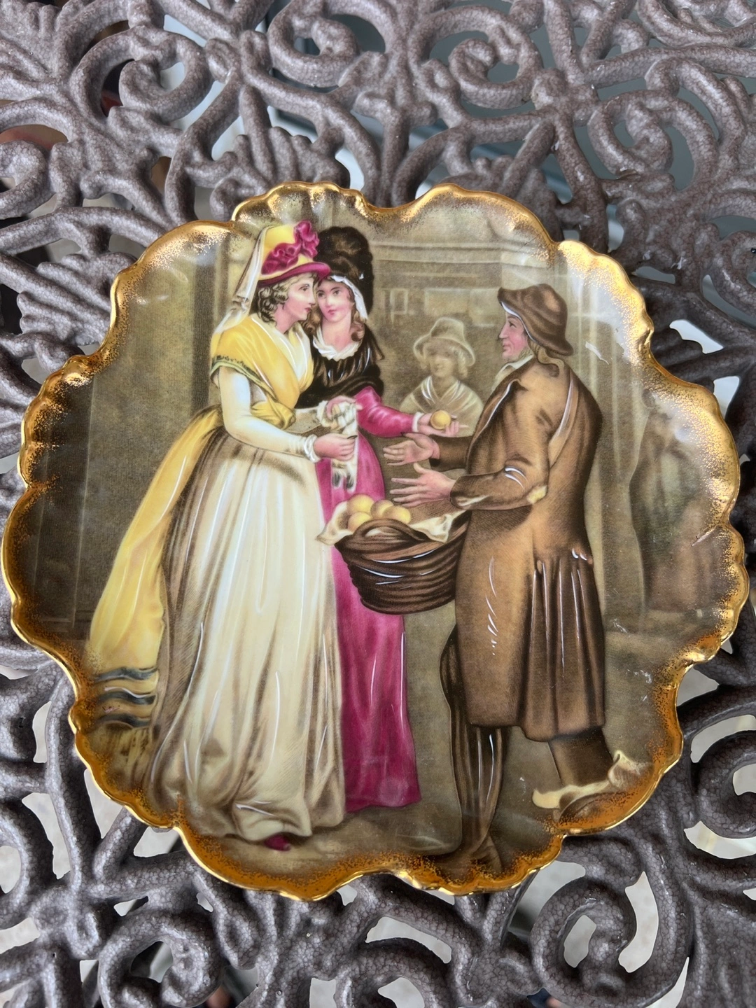 Decorative plate. Features a charming scene of people bartering fruit. Gold gilded edges. Made in France.