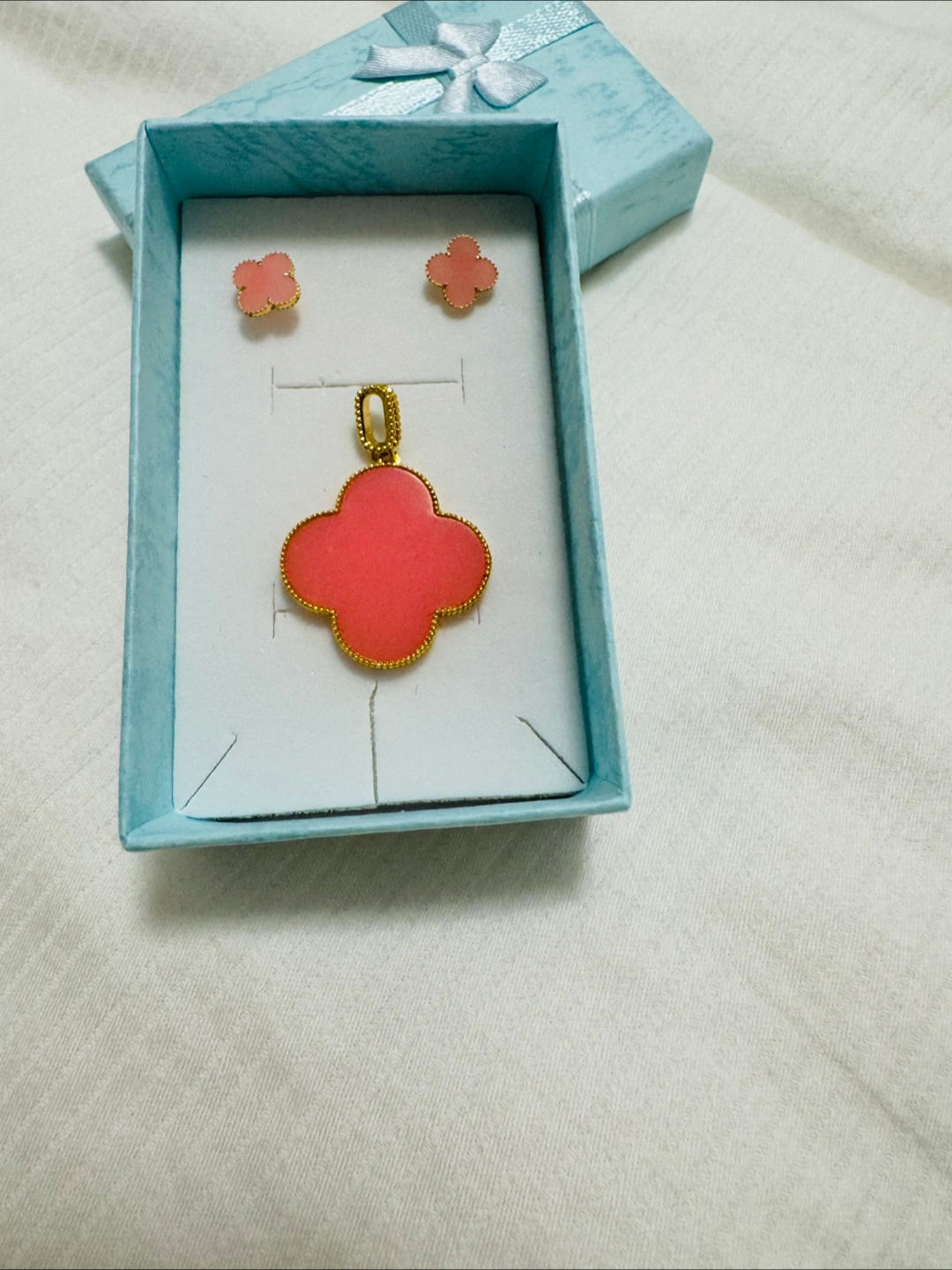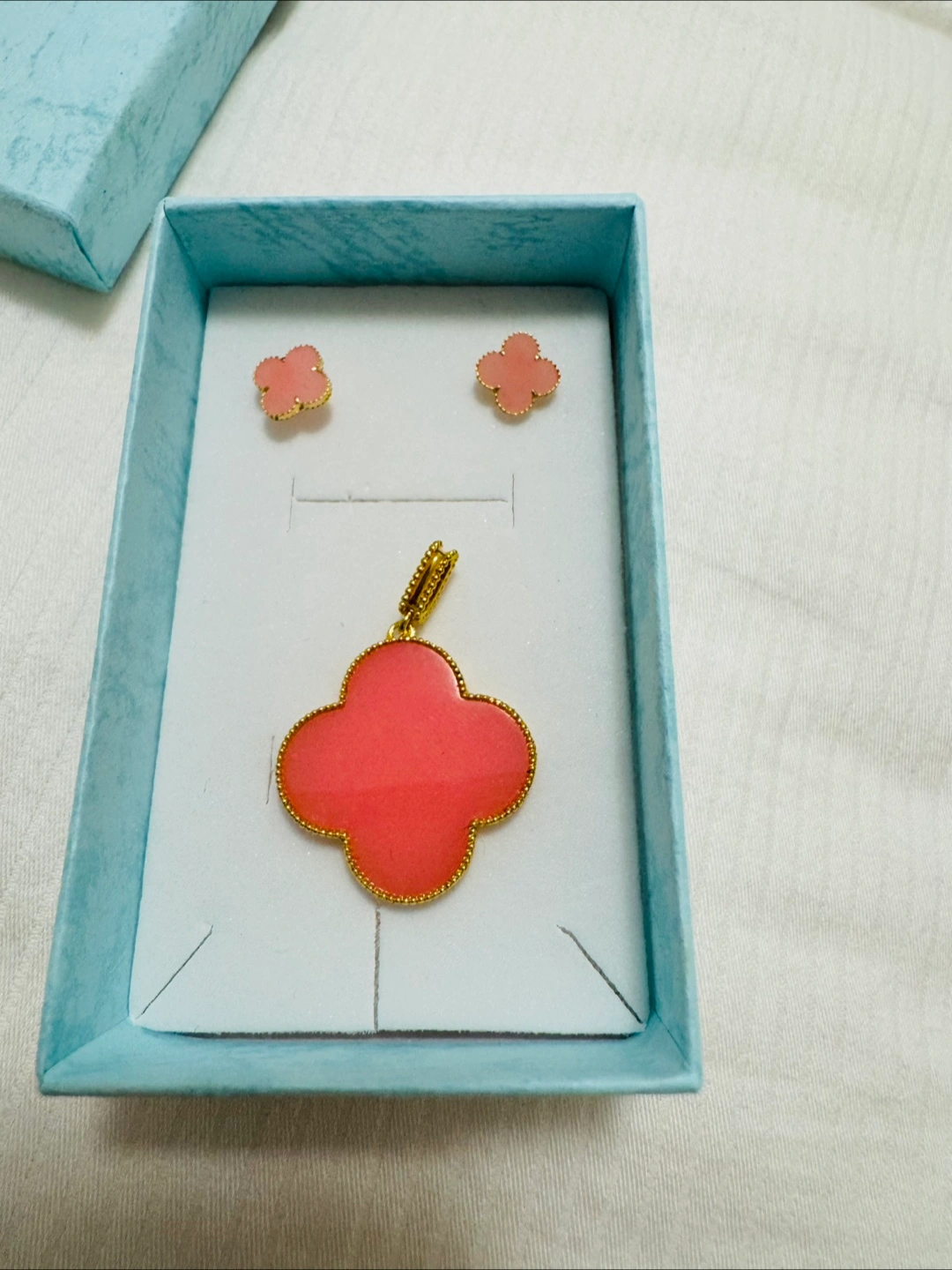 Beautiful pink clover gold pendant (25mm) and earrings set. 18k gold . Presented in a light blue gift box. Perfect gift. New