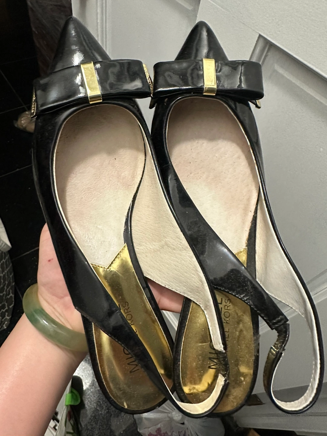 Black patent leather slingback heels. Gold bow detail. Size 8M. Slight wear.