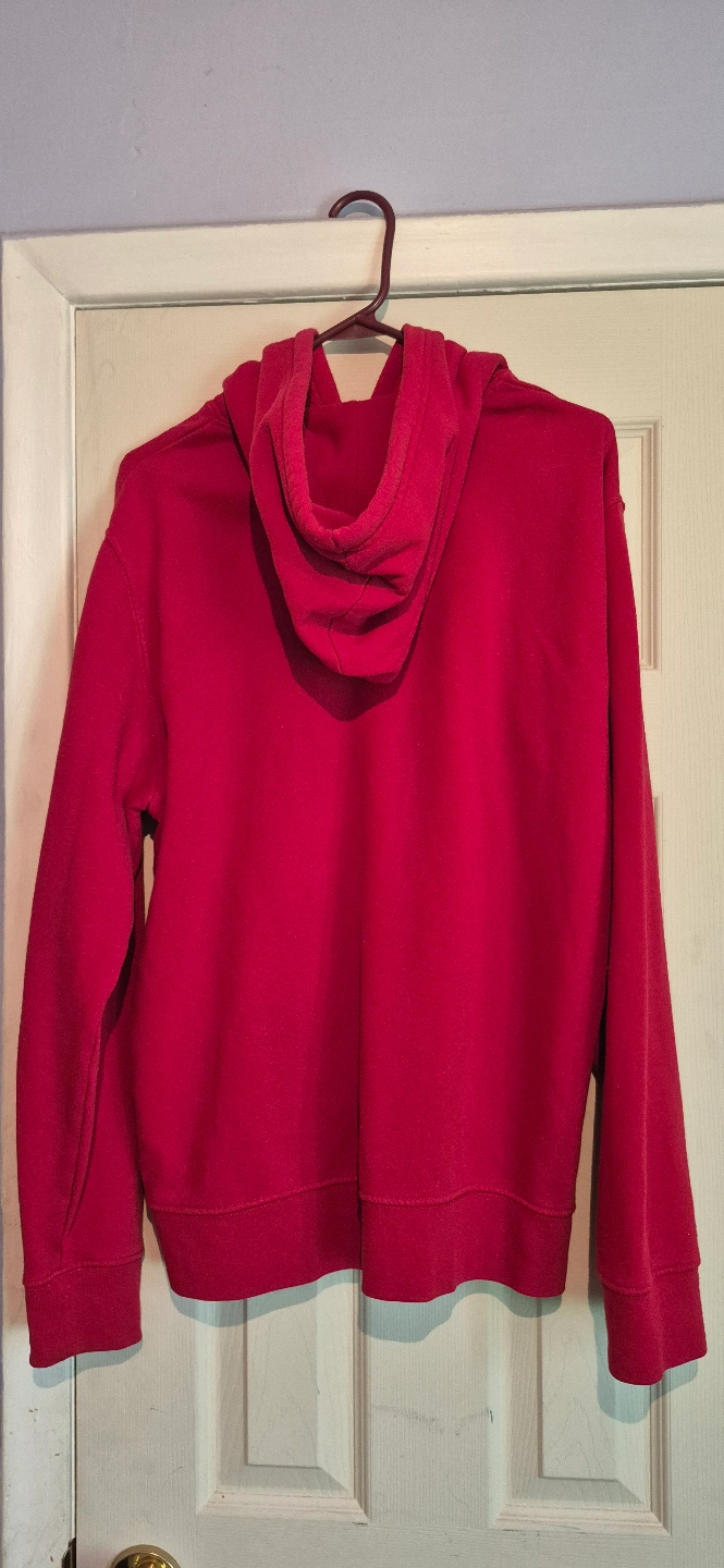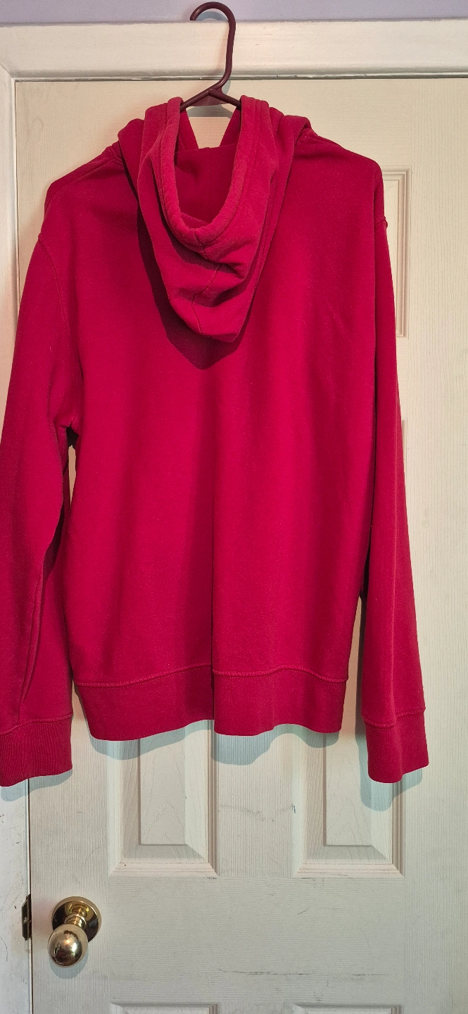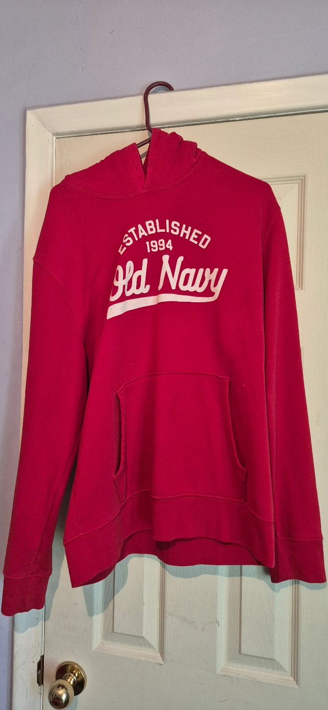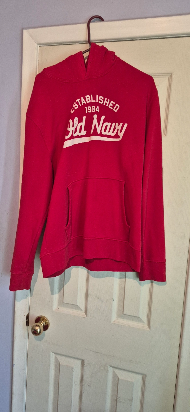 Women's Old Navy red hoodie. unisex. Features a kangaroo pocket and long sleeves. Established 1994 graphic on the front. Pre-owned. no tares, rips or stains. intact.
